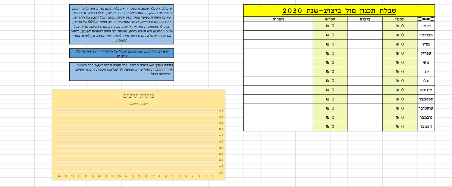 - טבלת “תכנון מול ביצוע” לכל שנה מ-2025 עד 2030, עם עמודות לביצוע, תכנון והפרש. תוכלו לעקוב אחרי ההתקדמות שלכם בכל חודש ולהבין אם אתם עומדים ביעדים.