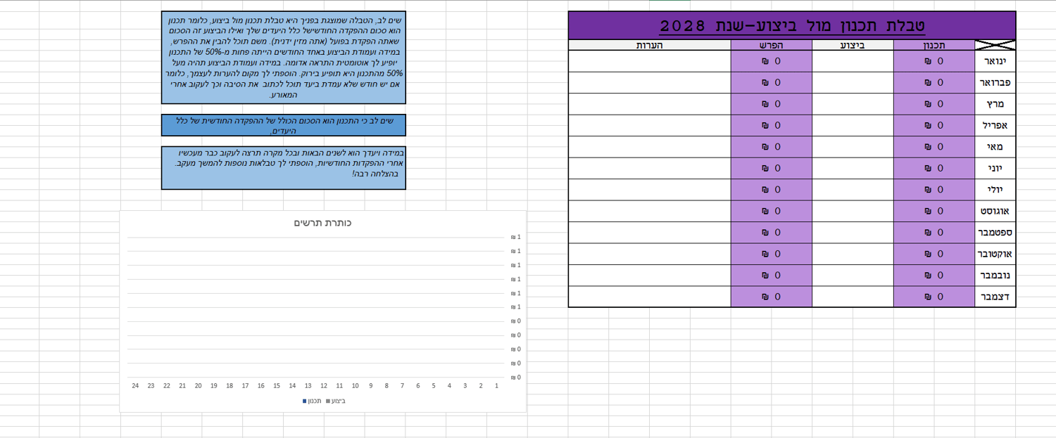 - קובץ זה כולל גרפים אוטומטיים שמציגים את ההתקדמות לאורך השנה עבור כל יעד, כך שתוכלו לראות בצורה ויזואלית את השיפור החודשי וההשפעה של ההפקדות לאורך זמן.