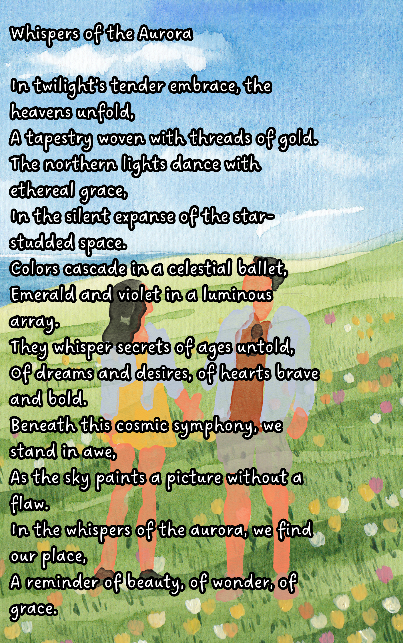 "Whispers of the Aurora" is a short, luminous poem that captures the celestial beauty of the aurora borealis. With rich, vivid imagery and heartfelt emotion, this printable poem is perfect for: