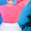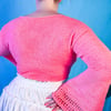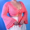 This tie-front top has a cropped length and is designed to hit at the natural waist in the back and angle up in front to tie at the bust. It is knit from the bottom up in one piece and joined at the shoulders. This top features a long bell sleeve with a lace cuff. Ties are knit in a dual-sided lace pattern with curved edges. Modifications are given to adjust body length and sleeve length.