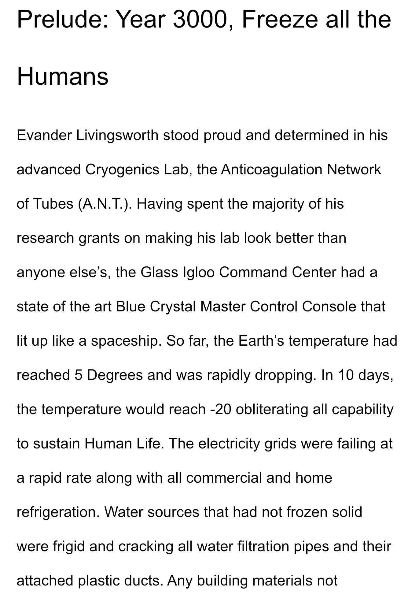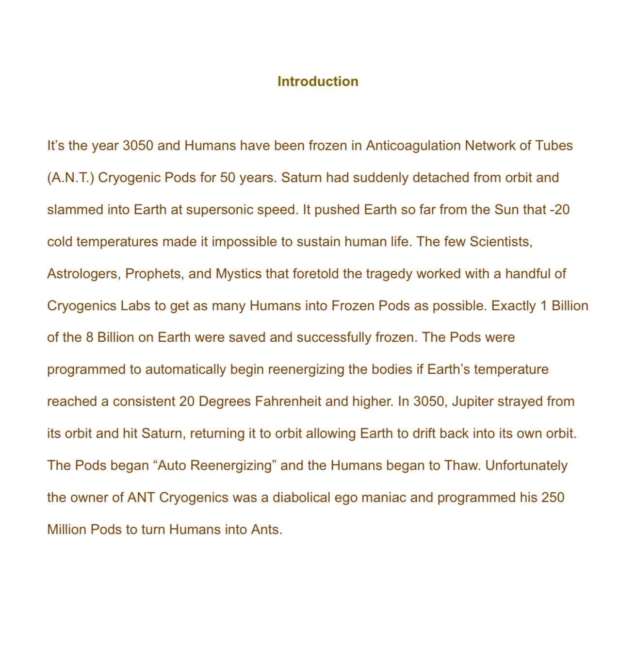 Free Audio Preview! (Book & 3 Chapters of Audio, most of Section 1) - Book 1 of the Series. It’s the year 3050 and Humans have been frozen in Anticoagulation Network of Tubes (A.N.T.) Cryogenic Pods for 50 years. Saturn had suddenly detached from orbit and slammed into Earth at supersonic speed. It pushed Earth so far from the Sun that -20 cold temperatures made it impossible to sustain human life. The few Scientists, Astrologers, Prophets, and Mystics that foretold the tragedy worked with a handful of Cryogenics Labs to get as many Humans into Frozen Pods as possible. Exactly 1 Billion of the 8 Billion on Earth were saved and successfully frozen. The Pods were programmed to automatically begin reenergizing the bodies if Earth’s temperature reached a consistent 20 Degrees Fahrenheit and higher. In 3050, Jupiter strayed from its orbit and hit Saturn, returning it to orbit allowing Earth to drift back into its own orbit. The Pods began “Auto Reenergizing” and the Humans began to Thaw. Unfortunately the owner of ANT Cryogenics was a diabolical ego maniac and programmed his 250 Million Pods to turn Humans into Ants.