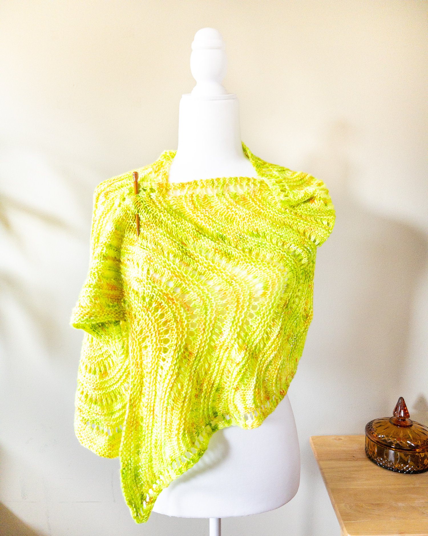 For best results, choose a semi-solid or subtly variegated yarn. The lace details and undulating texture may get lost in high contrast colorways.