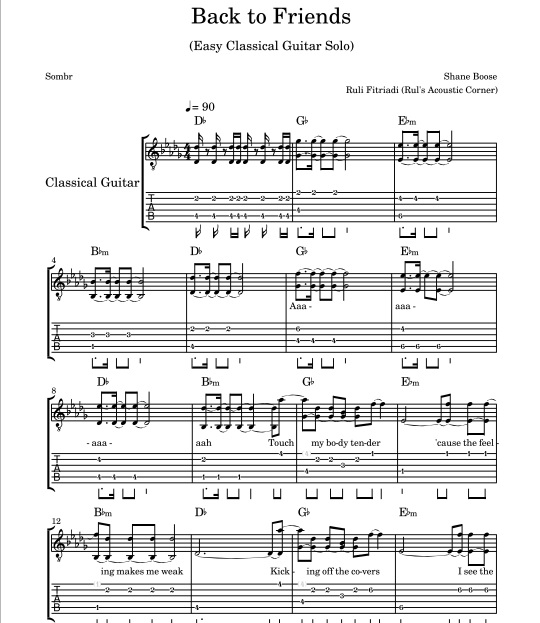 Play the Back to Friends by Sombr (Classical Guitar Solo) with this simple, easy-to-play, yet professional arrangement. Suitable for both advanced and enthusiastic students, this sheet music is clearly formatted for motivated students who want to challenge themselves with popular music.