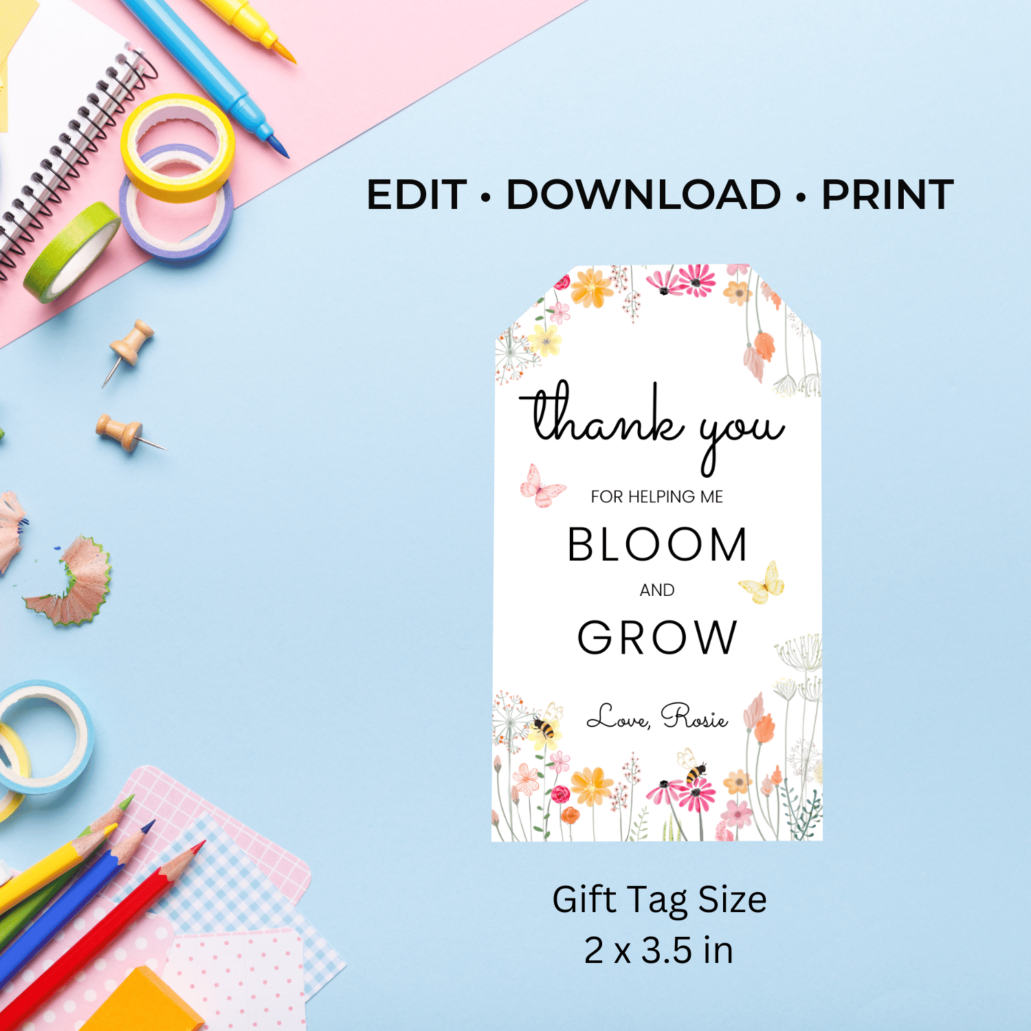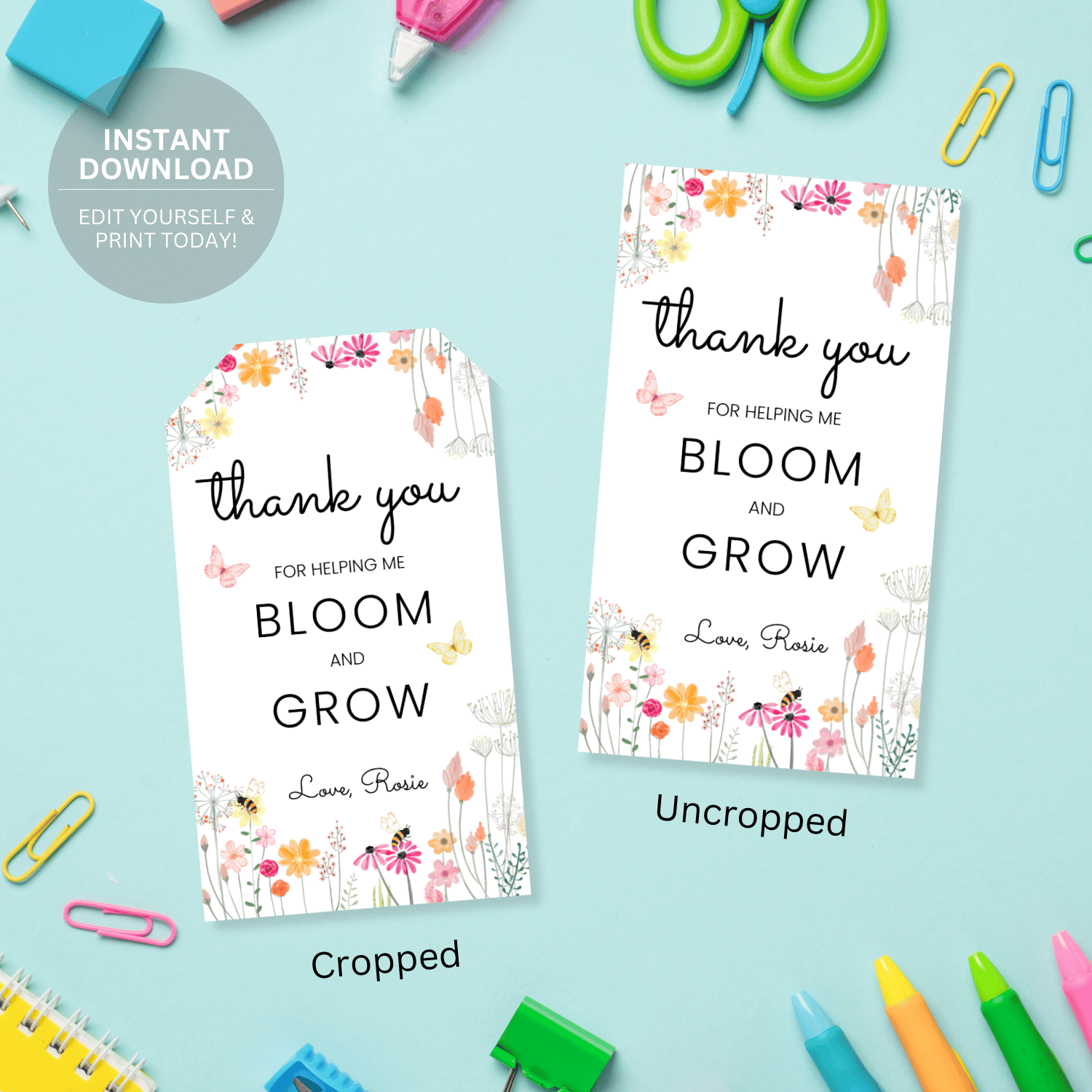 These printable teacher appreciation tags feature the message “Thank you for helping me bloom and grow”, designed with delicate wildflowers at the bottom, sweet bees and butterflies around the tag, and a soft, nature-inspired feel. A thoughtful finishing touch for any teacher gift that expresses growth, care, and gratitude.