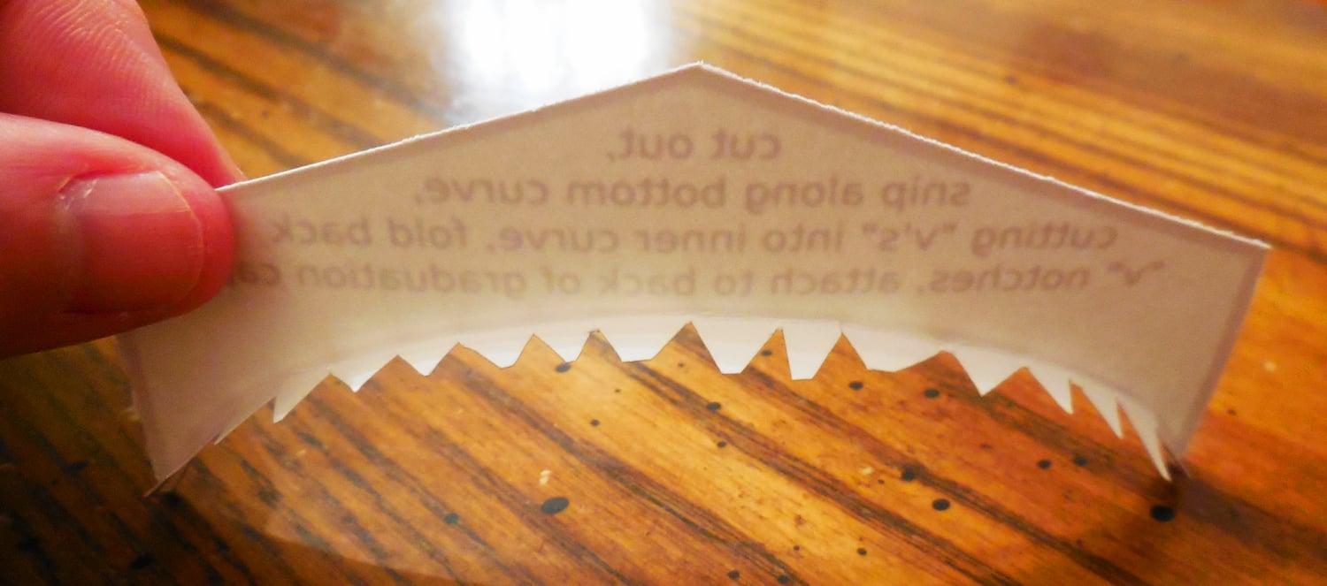 Cut out the graduation cap, then cut out the 2 attachments on the back. on the cap attachment, cut away every other "v" notch, from the center out, fold the "v" notches and fold them back underneath. Cut out the strip, start from the center and attach the strip to the bottom of the "v" notches. Then attach both combined attachments to the back of the graduation cap, centered so that it doesn't show on the front, then tape or glue / attach to the plastic headband and wear!
