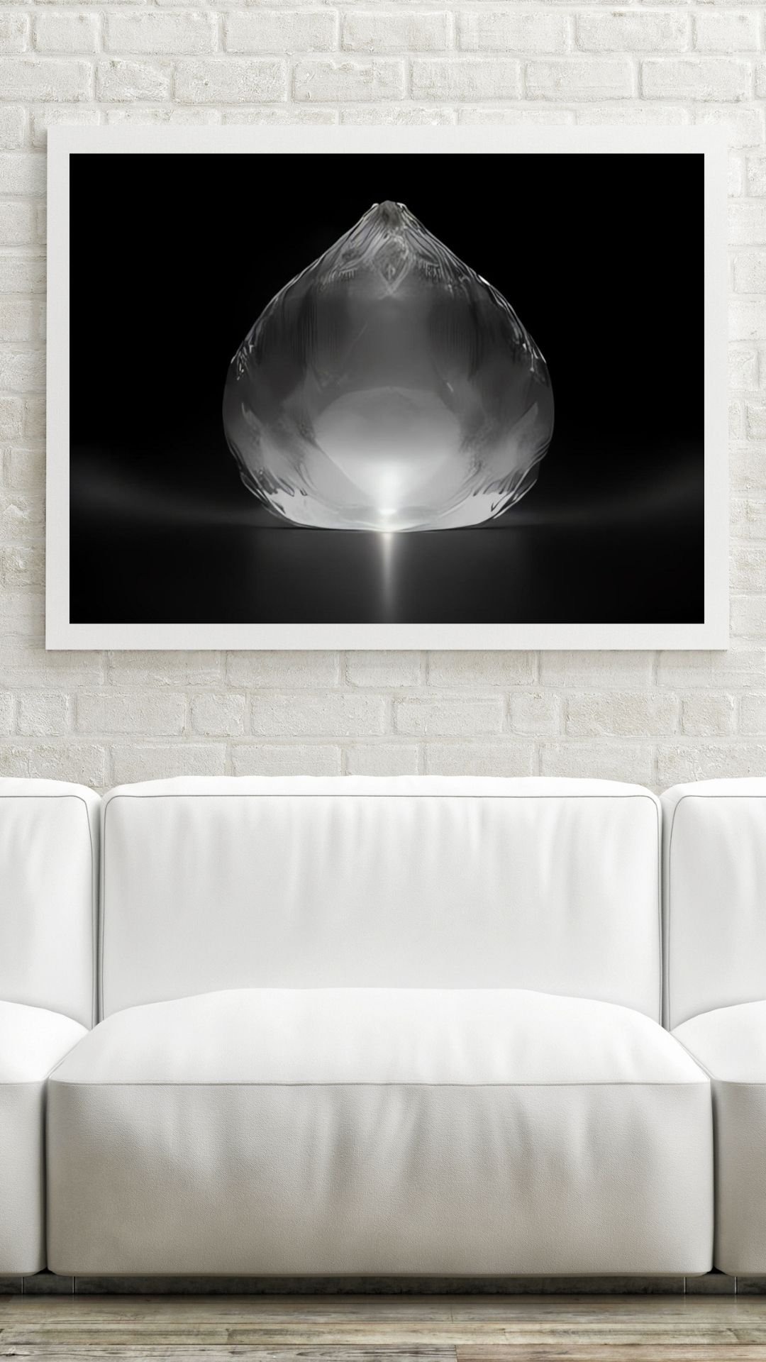 The design features an abstract light form reminiscent of a lantern or glass lamp, floating in a restrained monochrome setting. Its smooth curves and subtle glow create a soothing visual rhythm that works beautifully in minimalist, contemporary, and modern interiors. The limited color palette allows the piece to feel present without overpowering the room, making it an ideal choice for spaces intended for rest, reflection, or focus.