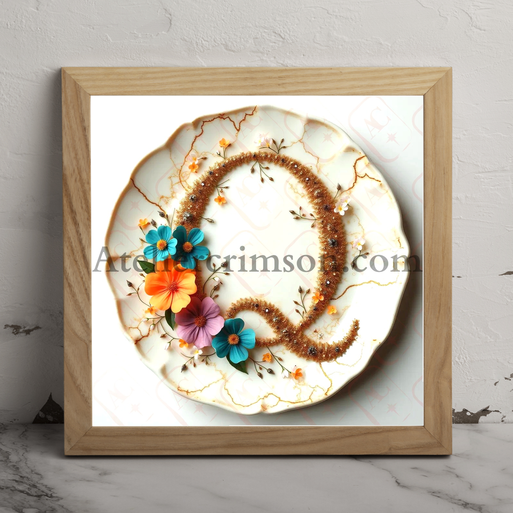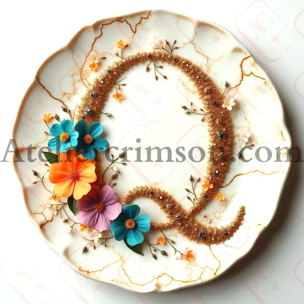 The letter Q flowers and procelaine .Download Now this high quality AI-generated image, perfect for adding a touch of tranquility and creativity to any space.