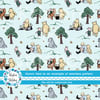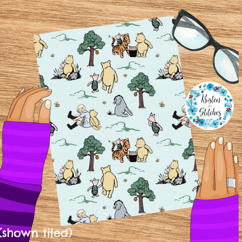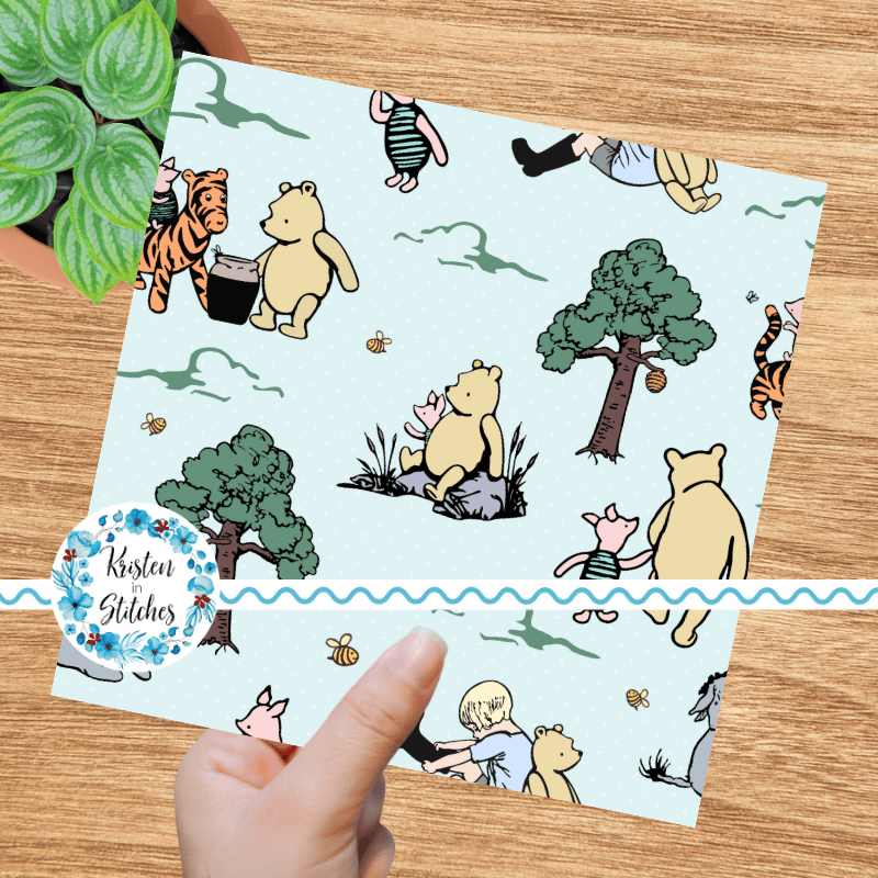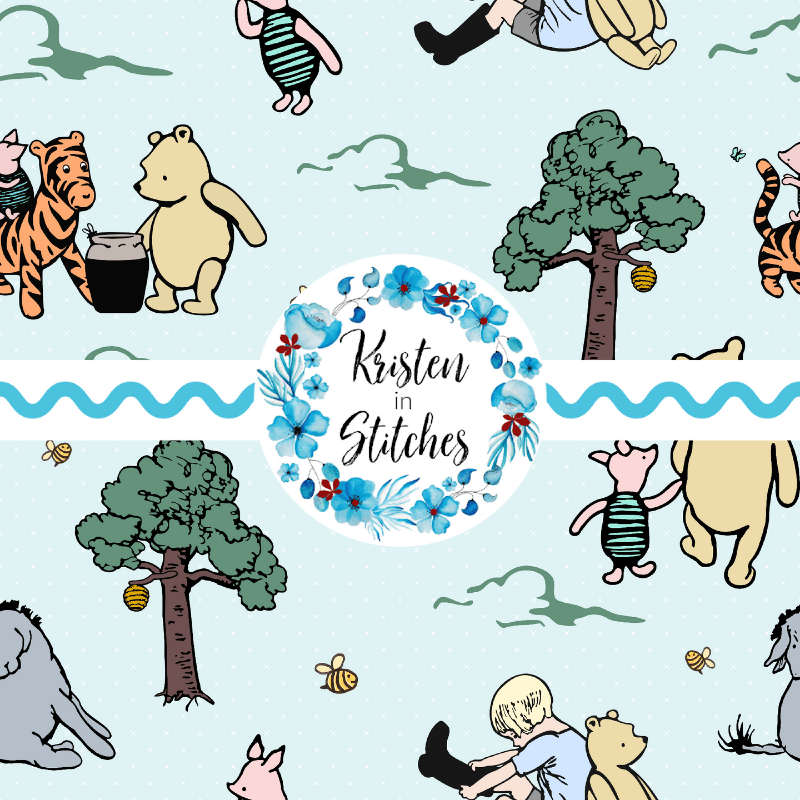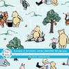 Classic Pooh storybook sketches from the 100 Acre Wood, including Eeyore, Tigger and Piglet on soft baby blue.
