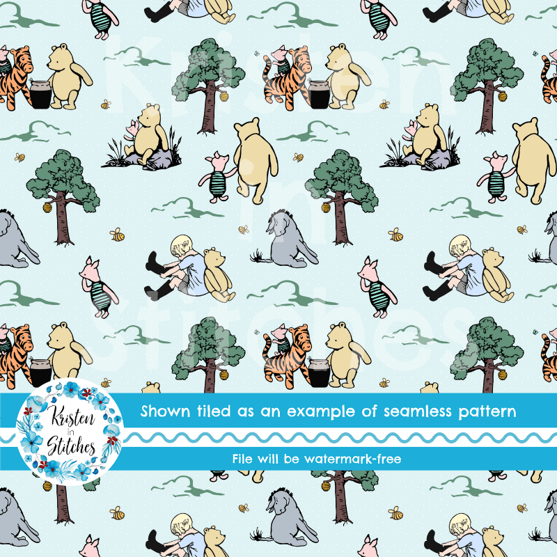 Classic Winnie the Pooh and Friends Storybook Sketches Nursery Seamless Pattern Soft Blue