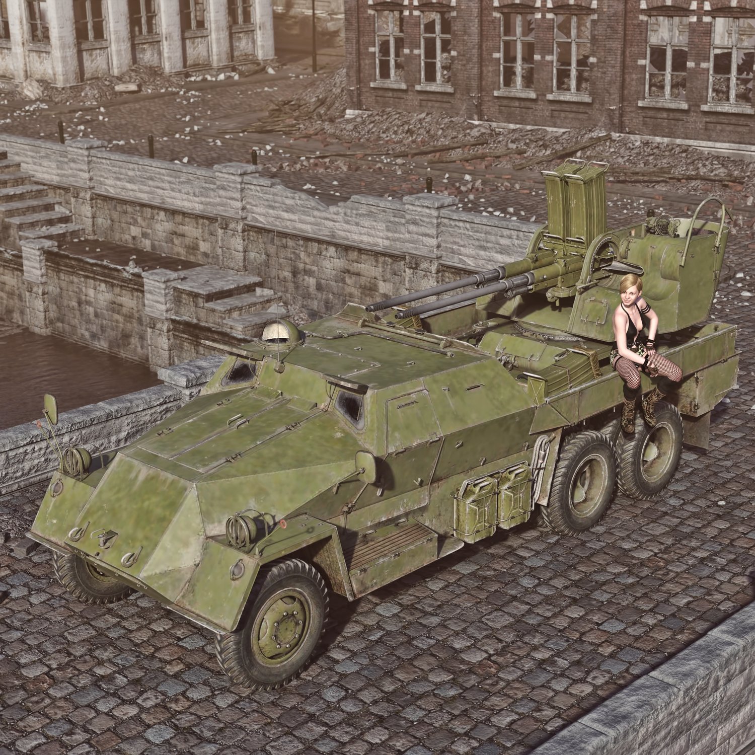 A Czechoslovakian self propelled anti aircraft vehicle. As a 50s design, looks as cool as many vehicles of that time, a kind of in the middle of WW2 and modernized. Armed with 2 30mm automatic cannons for it's main job, and some moderate armor for protecting the crew. Though the design is outdated, some countries still deploy it. Turret and gun rotate and pivot. Good for combating with low and mid flying aircraft. Hatches and doors are rigged also, for more realistic pictures. Has internals and rear space for troops, but it's very limited. The prop is converted and rigged for DAZ.