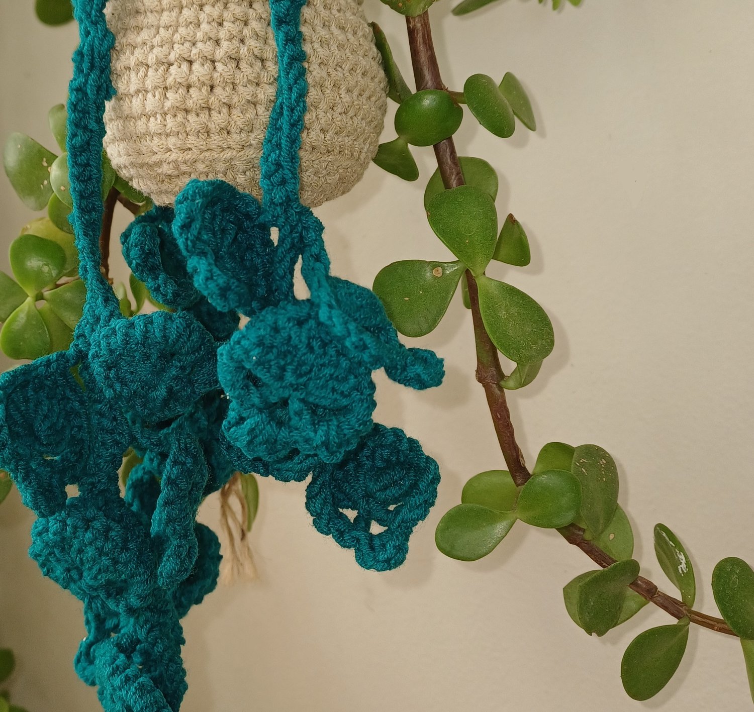 Whether you display it as a brooding wall hanger or a creepy-cute hanging plant for the car, Skull Ivy adds an unforgettable edge to your collection of crochet florals.