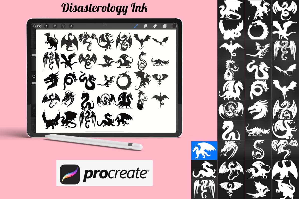 Pack of dragon silhouette Procreate Stamp Brushes! These dragon stamps are perfect for making illustration projects or any procreate purpose. You can use these in any colour or opacity and they can be resized to best fit your art.