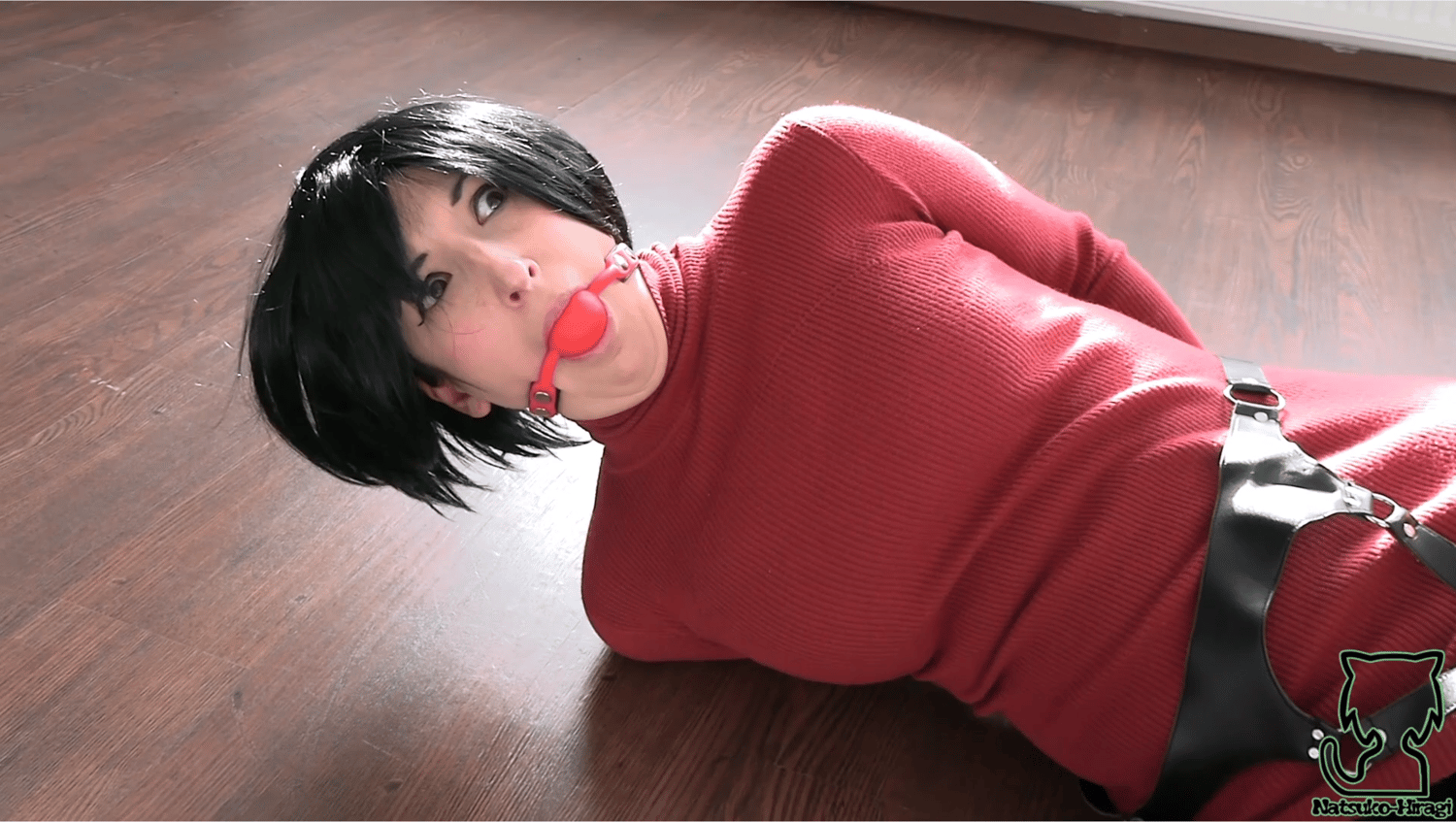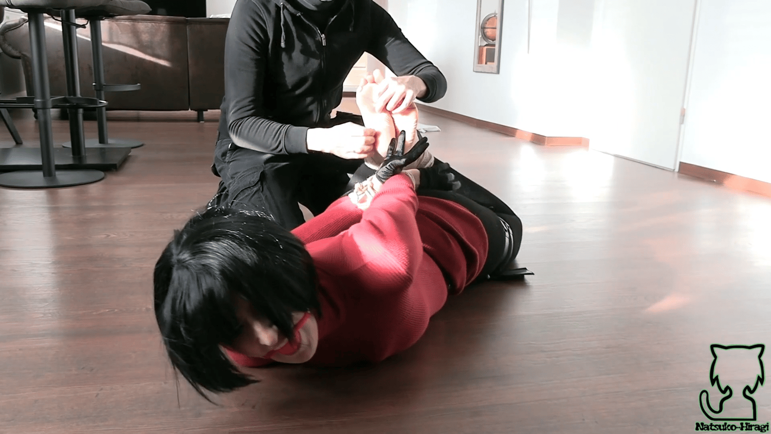 Video includes: B. Gag, rope bound, shoes taken off, barefeet, tickling, c. form, struggling, moaning, gagtalk