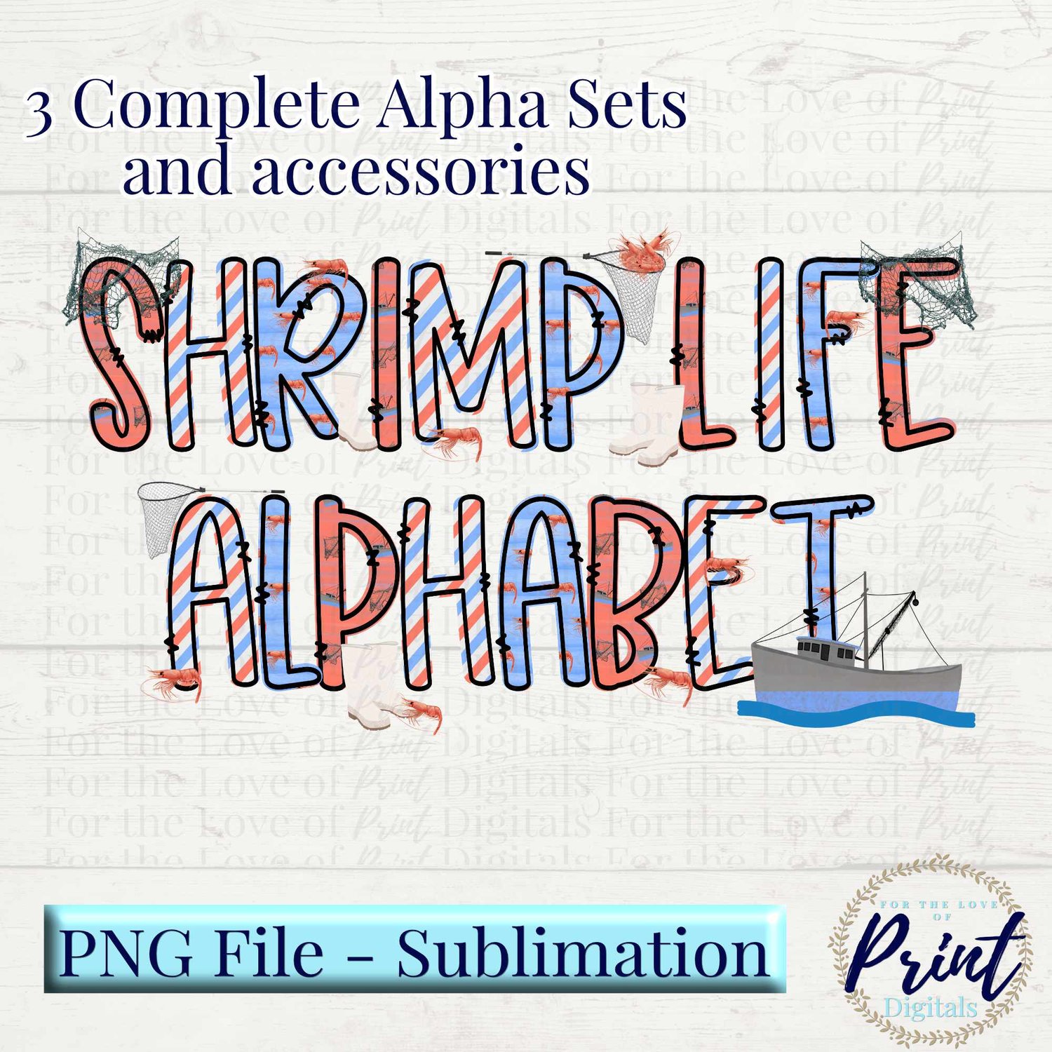 This is our Shrimp Life Alphabet Bundle Digital Design. You will receive 3 complete alphabet and 9 accessories. All letters and accessories are saved as individual files. These are great for sublimation and creating t-shirts, mugs, blankets and so much more. Use the alphas to create names and sayings as shown in the example graphic.