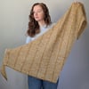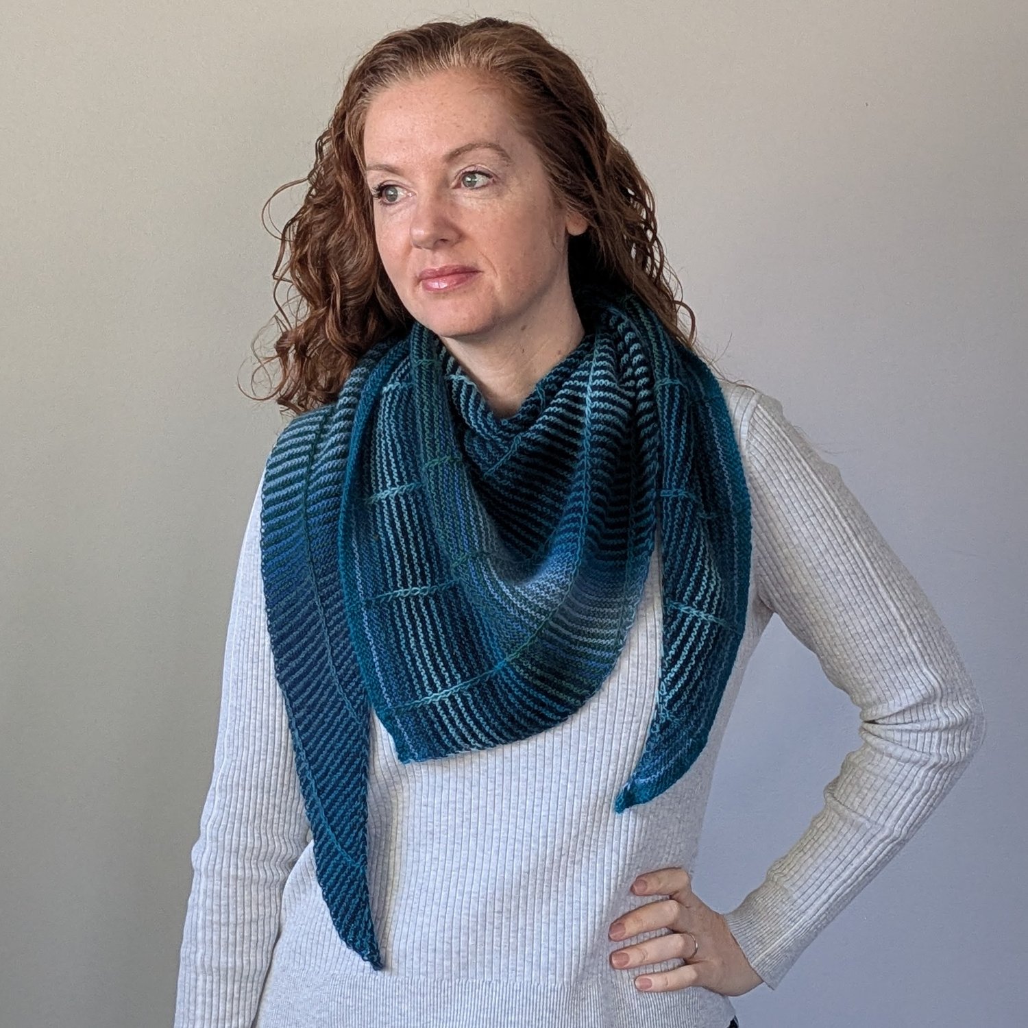 Slightly Askew is an asymmetrical triangular shawl knit starting from the side point, and getting continually wider. It is worked in alternating garter stitch stripes throughout with slipped stitch columns to emphasize the slant. The increases occur at the same rate until towards the end of the shawl, where they increase to create a thinner point for the final edge.
