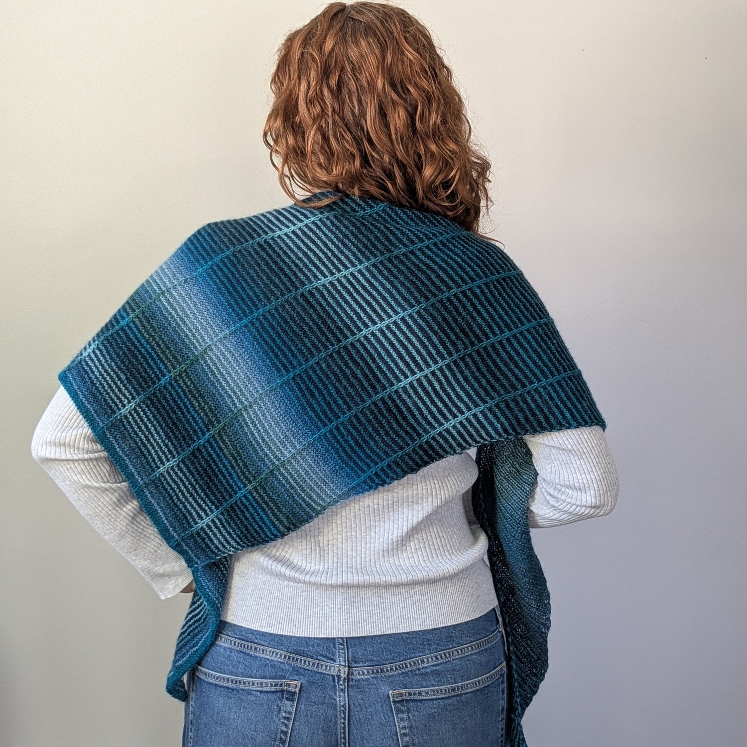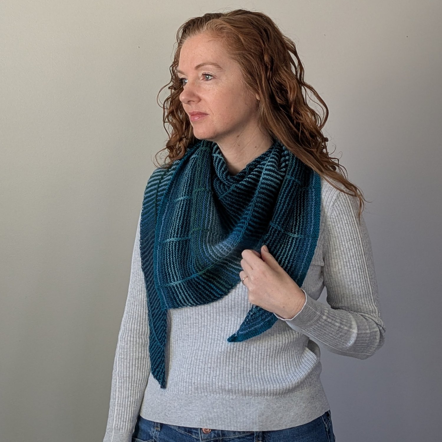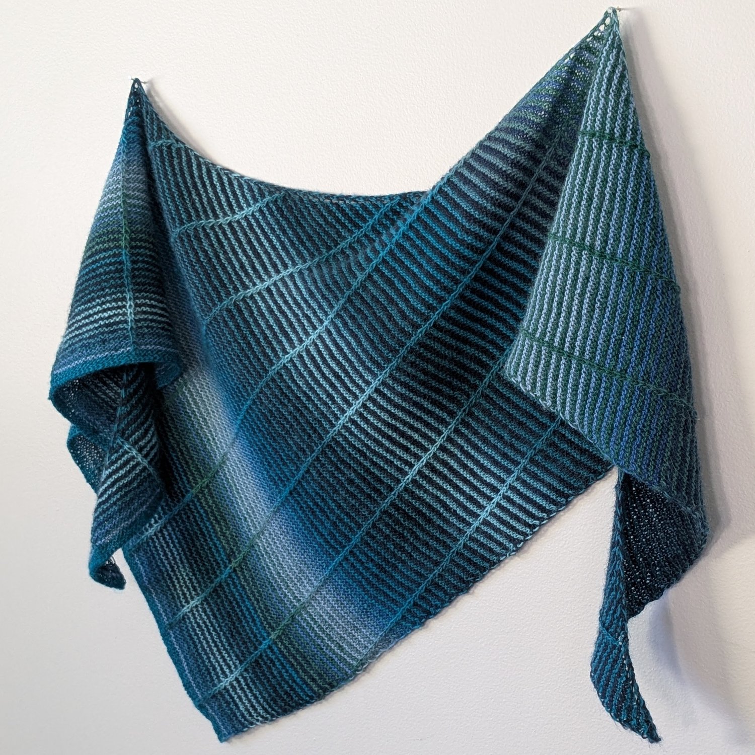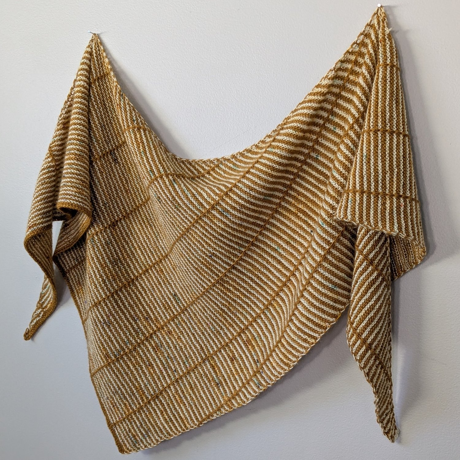 Slightly Askew is a shawl based on a really simple idea - delightfully squishy garter stitch stripes in an asymmetrical triangle shape, along with some slip stitch columns running perpendicular to the stripes to emphasize the slight tilt to it all.