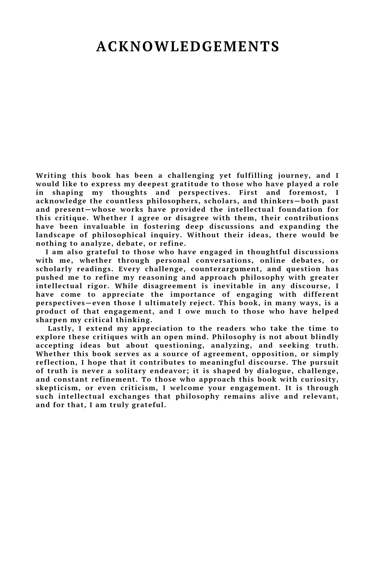 From the metaphysical inquiries of Ancient Philosophy to the intellectual rigor of Medieval Scholasticism, the book explores how different systems sought to define reality, knowledge, and ethics. It critiques the internal conflicts of Rationalism and Empiricism, the speculative excesses of German Idealism, the radical skepticism of Existentialism, and the self-defeating nature of Postmodernism. Political philosophies—ranging from Marxism to modern ideological movements—are also scrutinized for their practical and logical limitations etc.