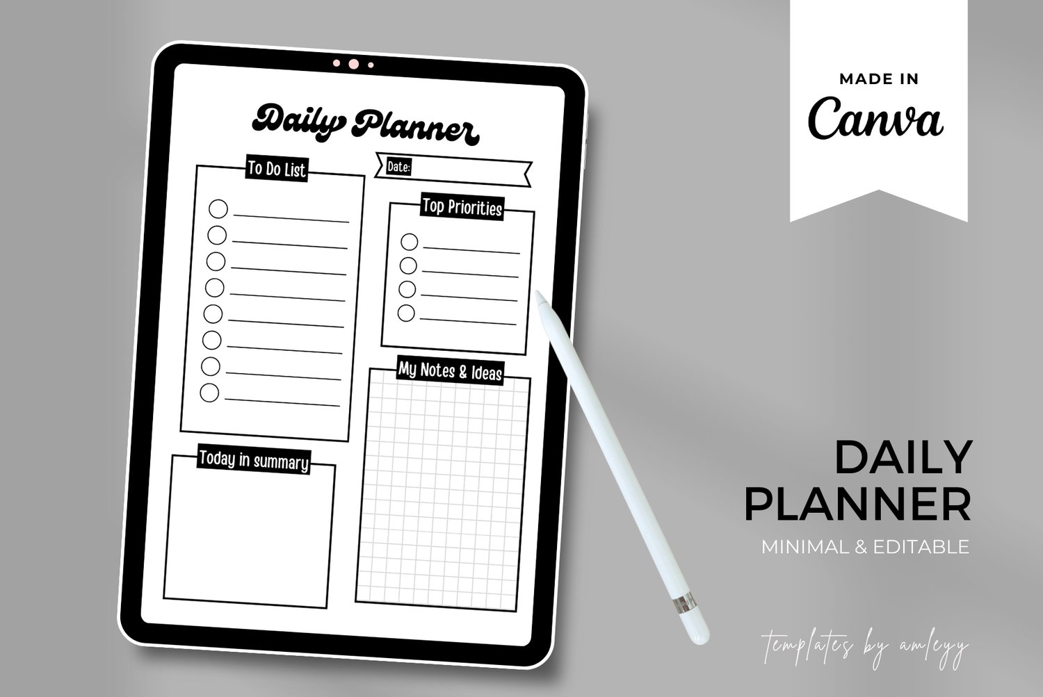 Monochrome Daily Planner Printable — Minimalist Daily Schedule Template — Editable CANVA Template — Productivity Planner Page — Modern Black & White Layout