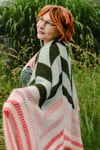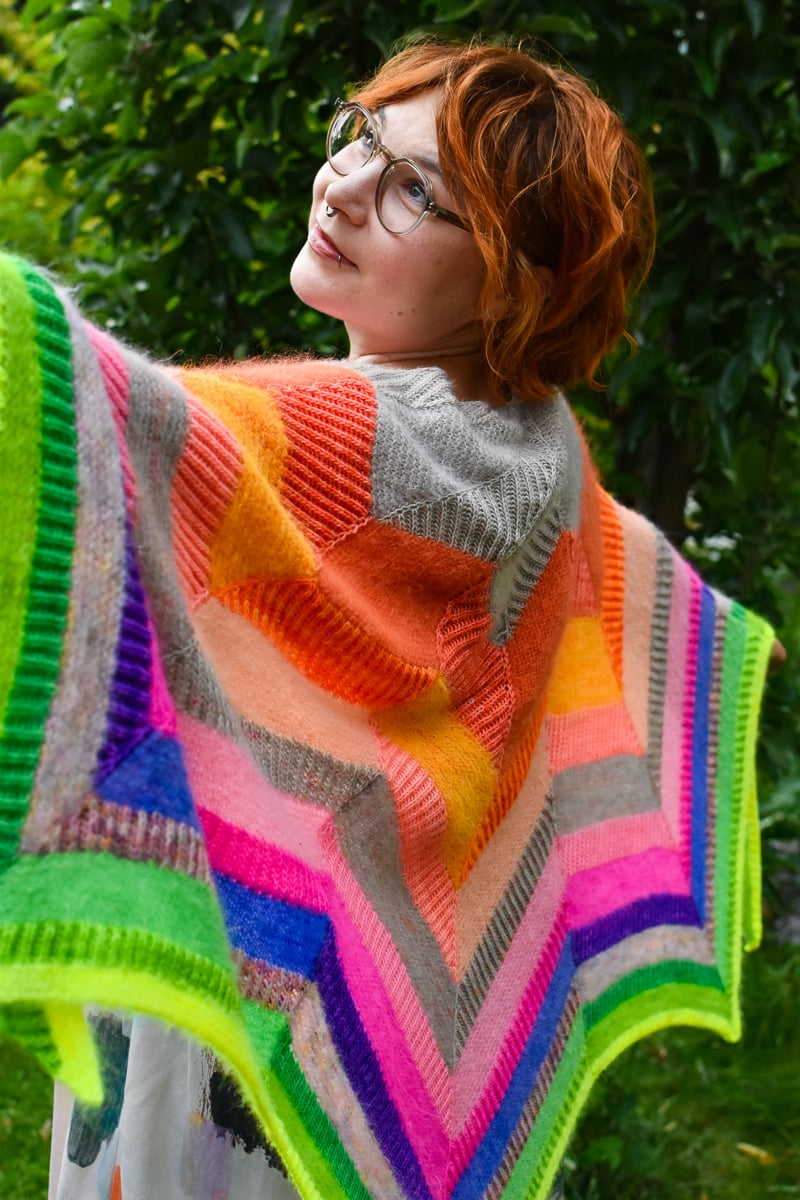 A colorful modular chevron shawl in Brioche and Garter stitch.