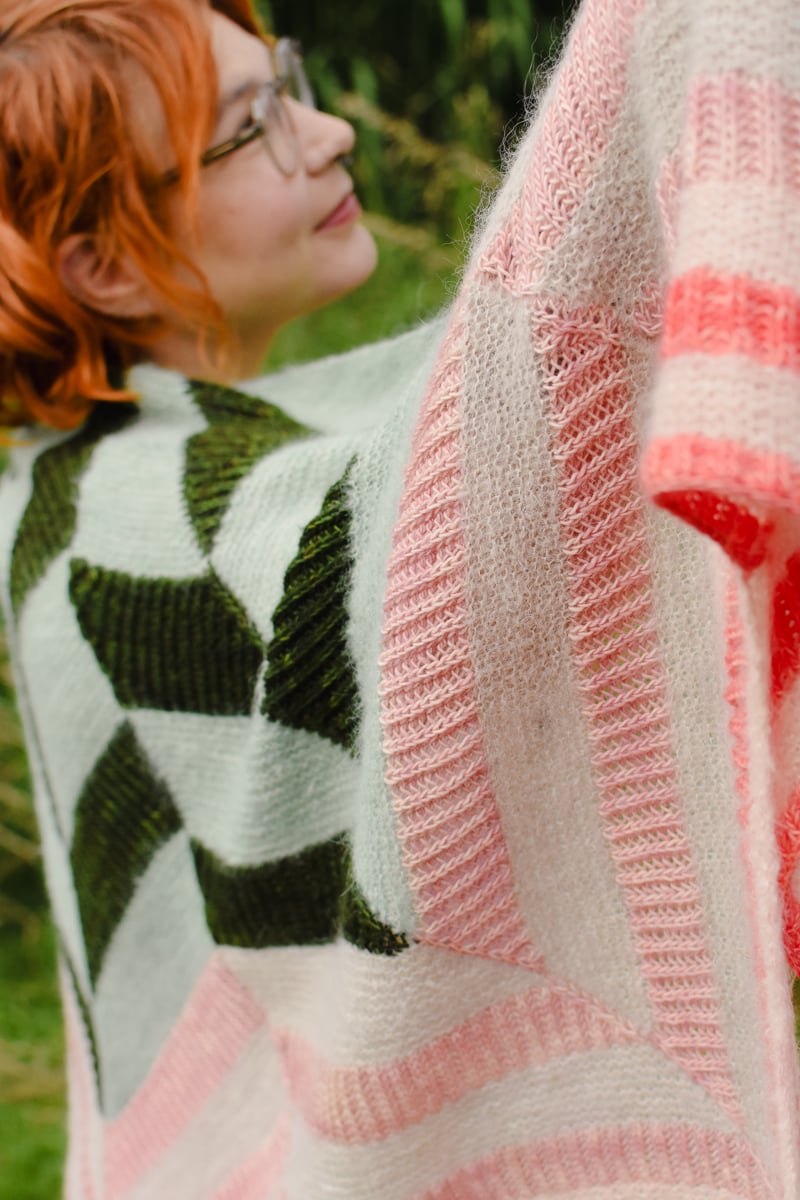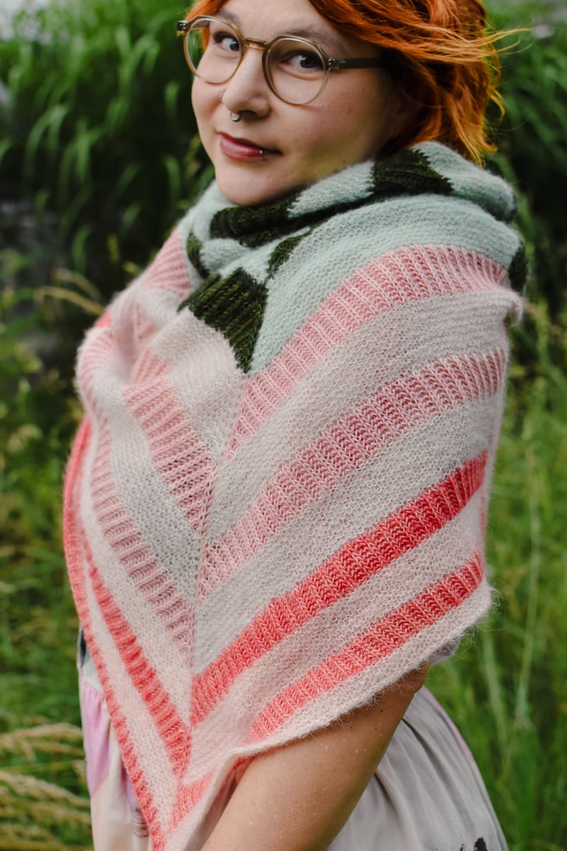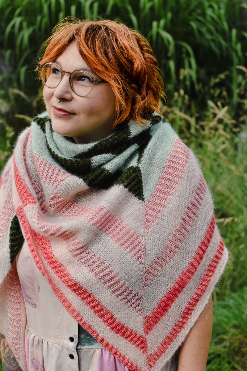 Each segment of this large shawl is worked top-down in stripes of Brioche and Garter stitch in two yarn bases, a Fingering weight and a fluffy Lace weight yarn.