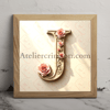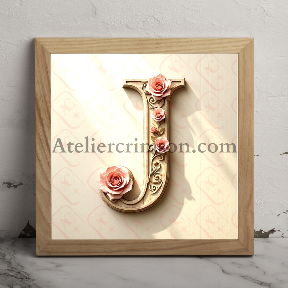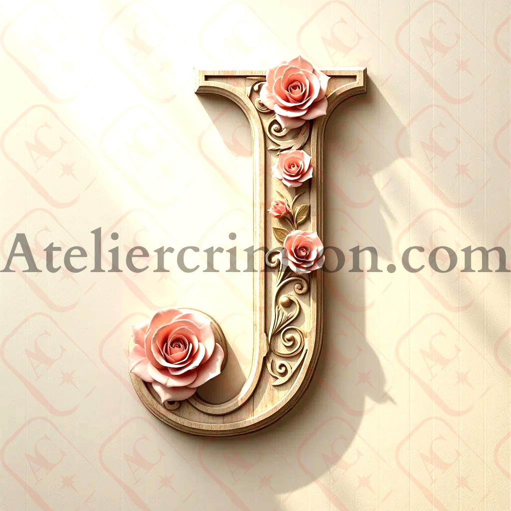The letter J soft beige wood and flowers Download now this AI-generated image of an elegant, mid-century style character crafted from wood with a soft, neutral background with geometric pattern. Nostalgic and elegantly worn atmosphere.