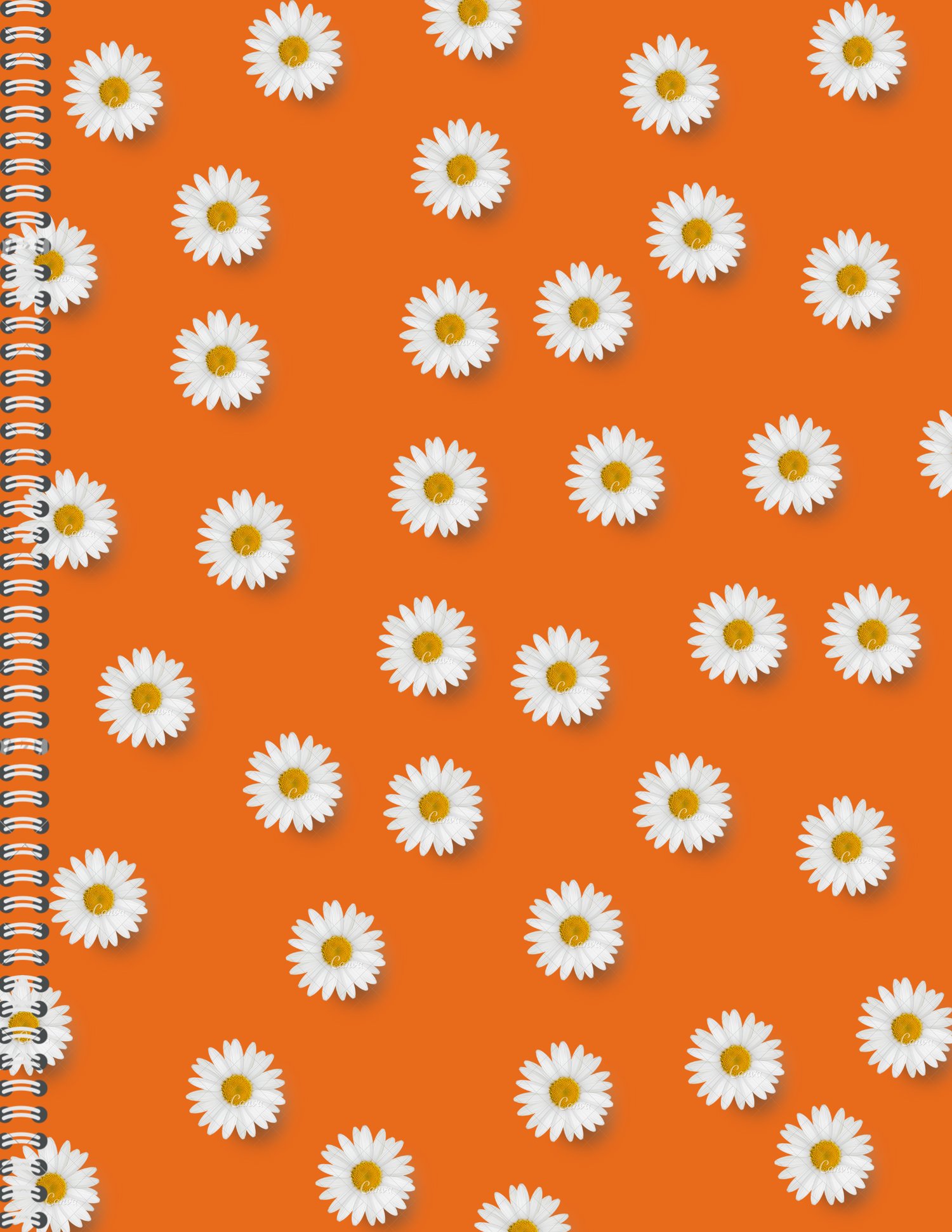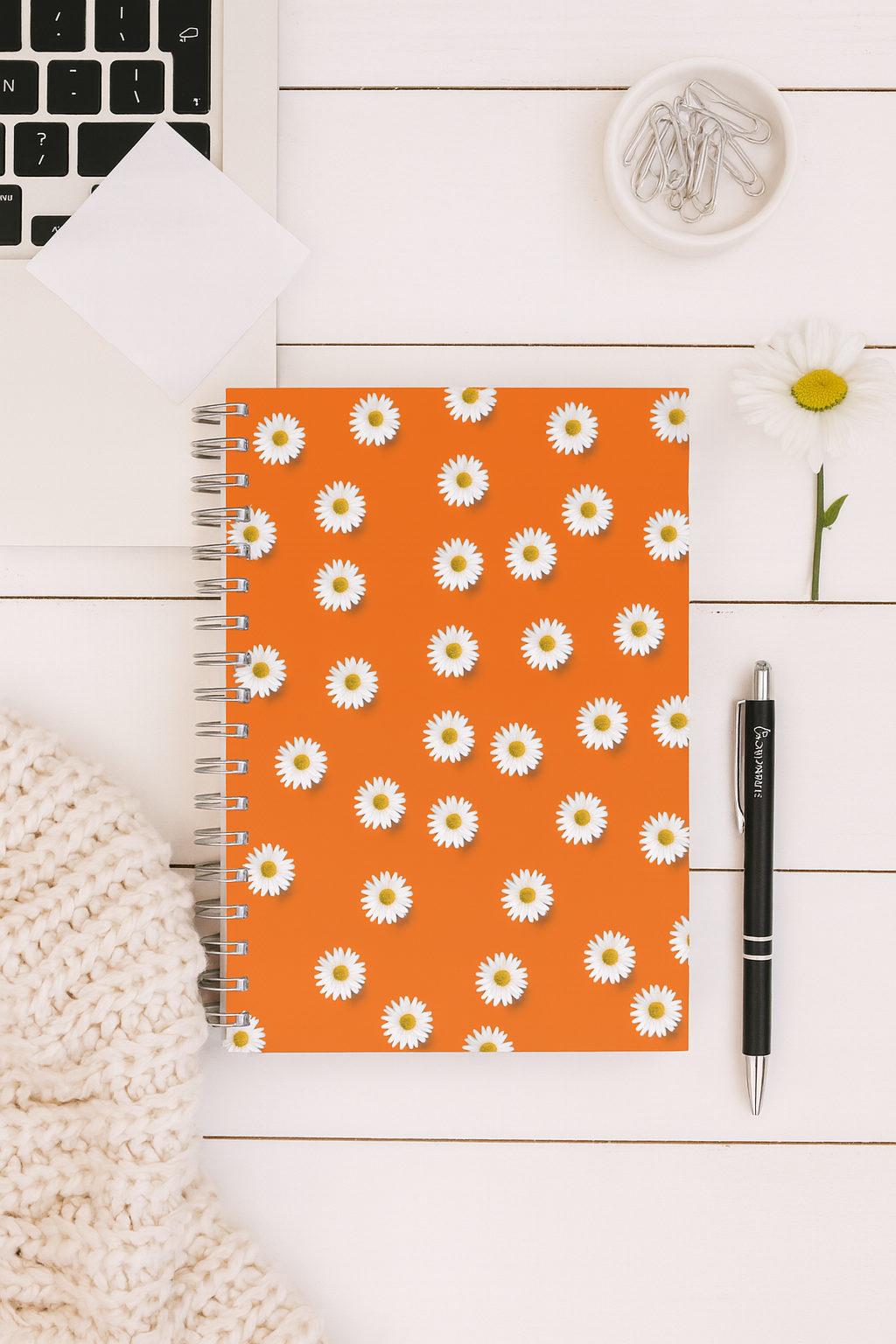 Designed with a vibrant orange background and scattered white daisies, this notebook brings a fresh, cheerful touch to your daily planning, journaling, or school notes.
