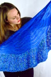 Reflection shawl, with a simple beginning that waves into ripples, ending with flecks of color. It will keep your mind calm and your hands busy, giving you time to reflect.
