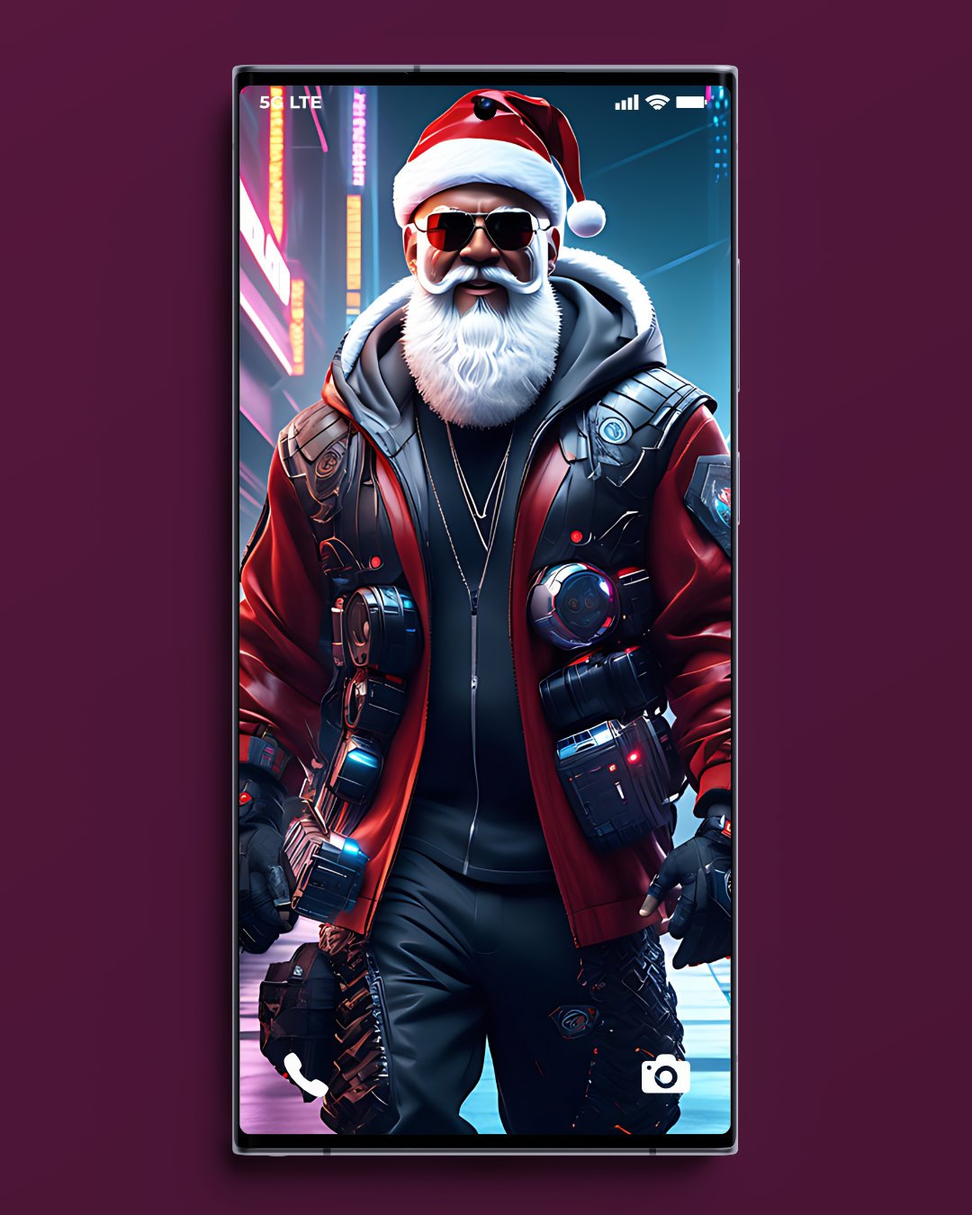 A gritty cyberpunk-inspired wallpaper featuring a badass Santa Claus decked out in futuristic attire, set against a backdrop of neon-lit cityscape.