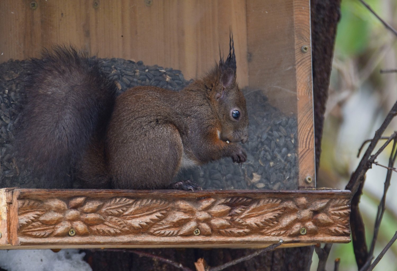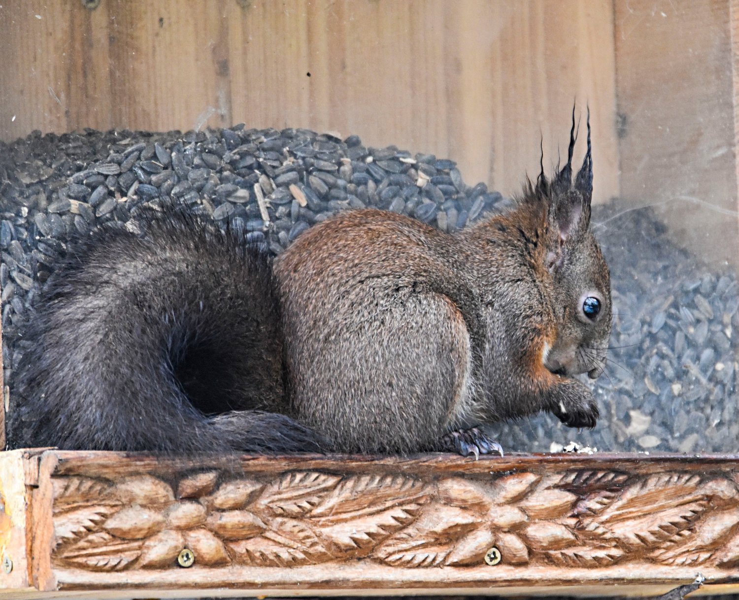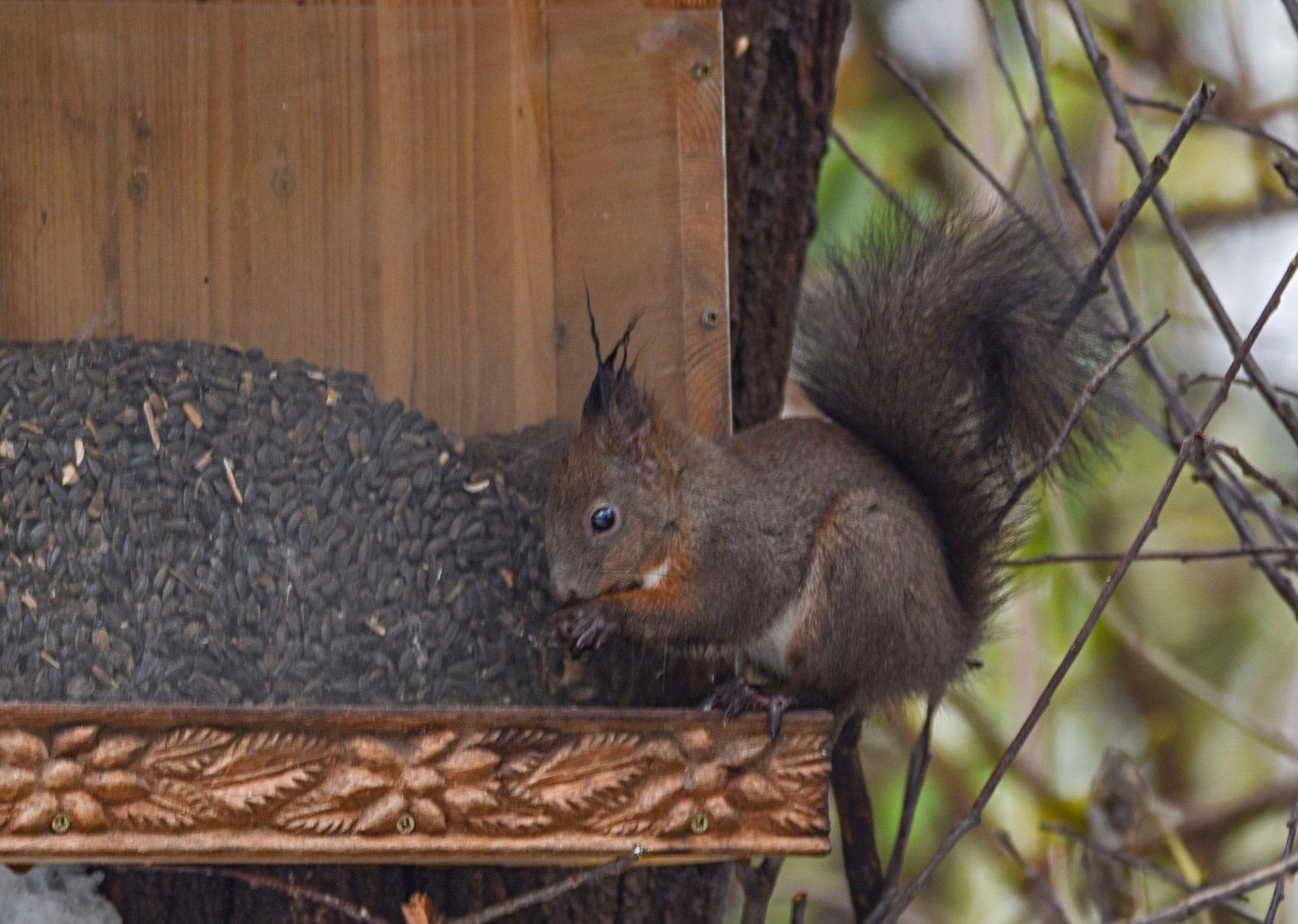 Eurasian red squirrel, winter fur, tufted ears, sunflower seeds, wooden feeder, wildlife photography, forest animals, nature close-up, squirrel eating, woodland creature, seed storage, rustic feeder, wildlife in winter, animal behavior, nature lovers