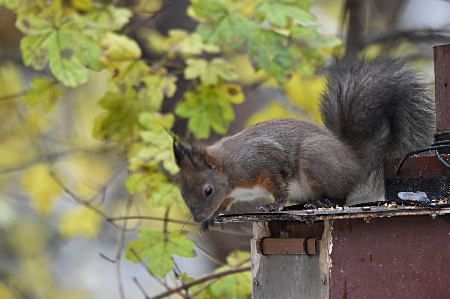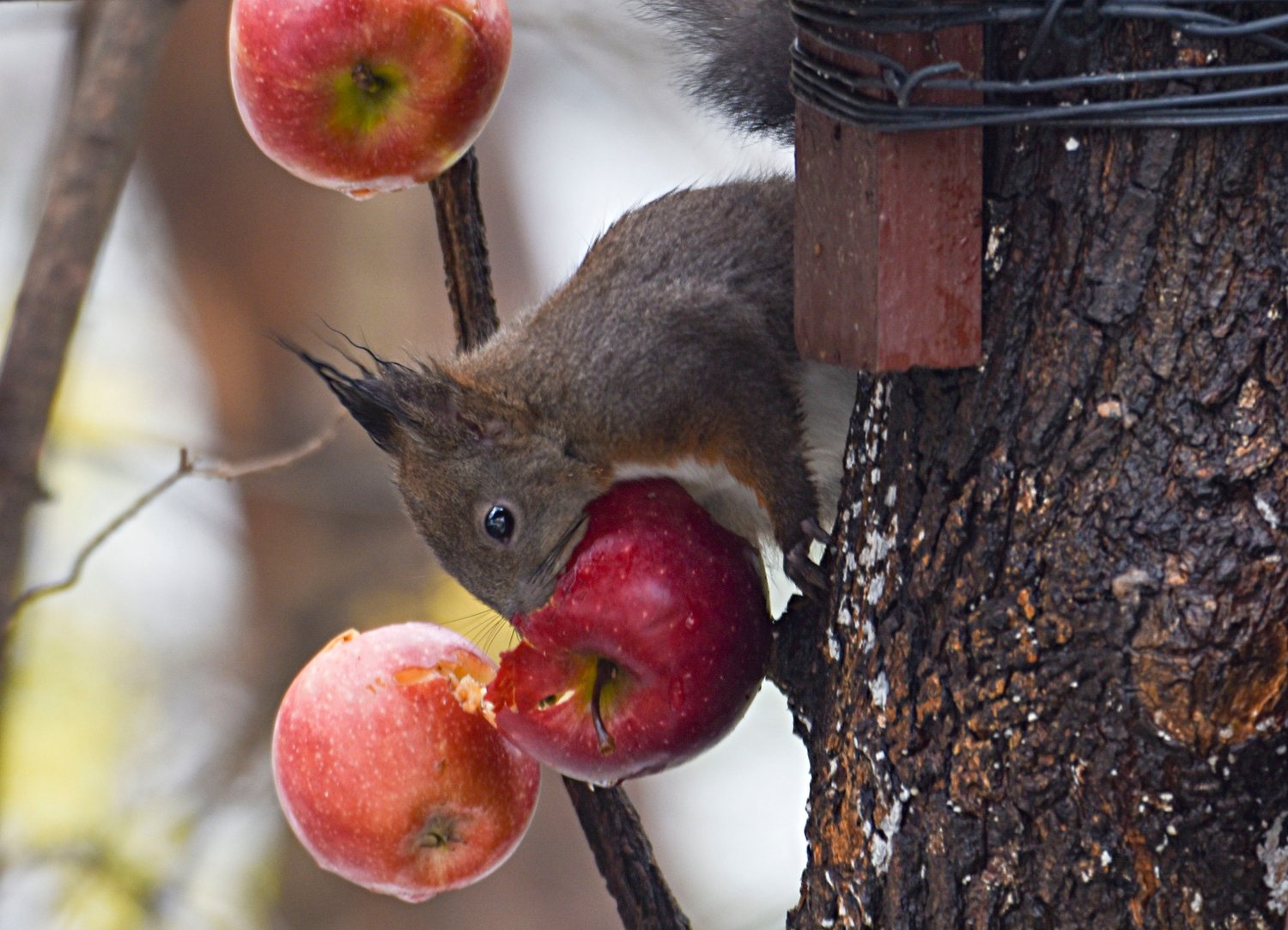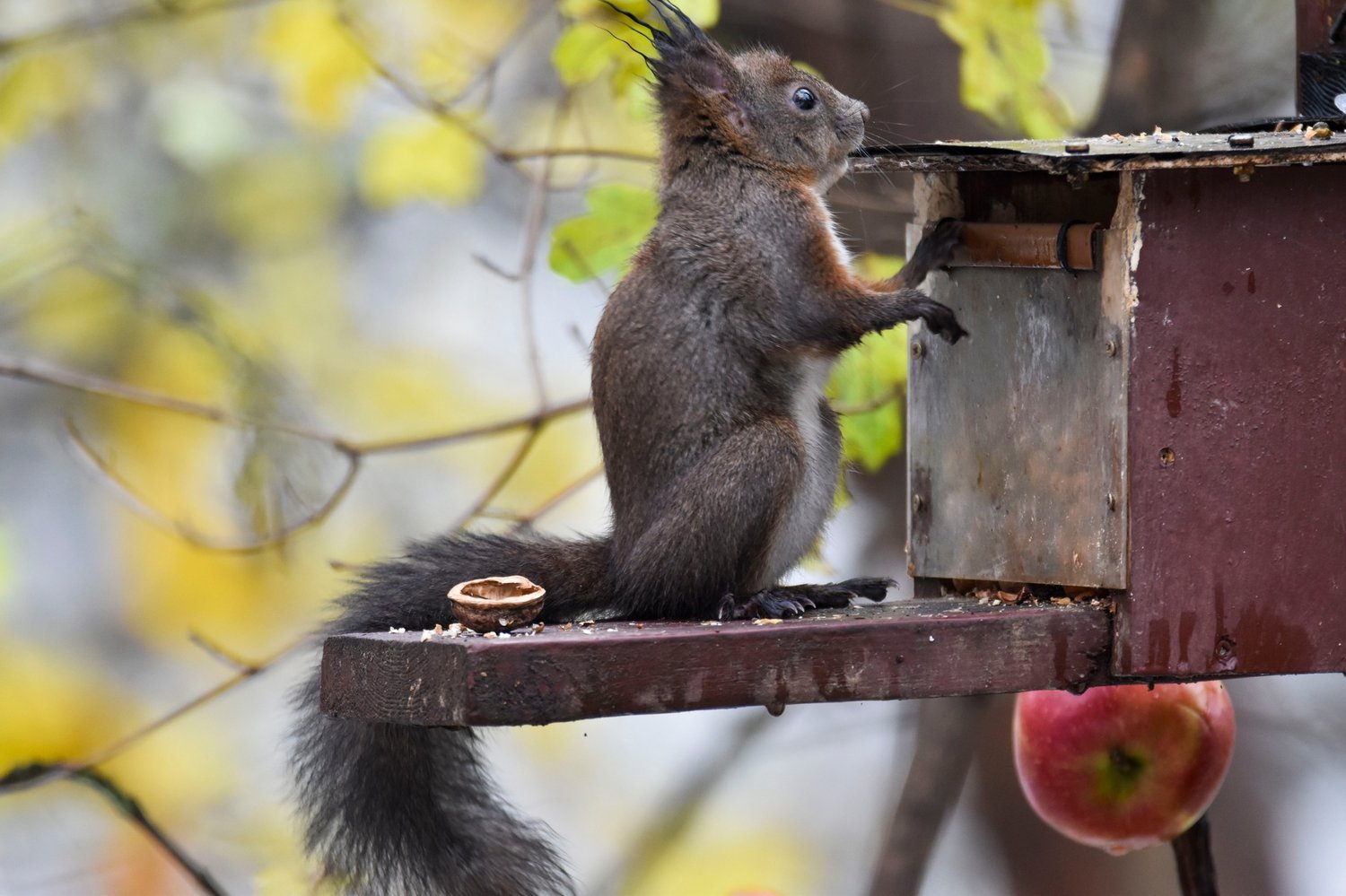 Eurasian red squirrel, winter fur, tufted ears, sunflower seeds, wooden feeder, wildlife photography, forest animals, nature close-up, squirrel eating, woodland creature, seed storage, rustic feeder, wildlife in winter, animal behavior, nature lovers