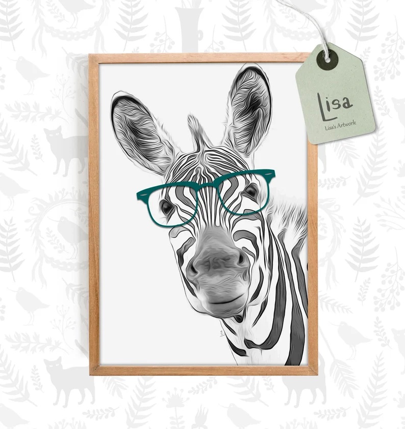 Zebra art print nursery, black and white prints, animal with glasses, printable poster, printable nursery, zebra wall art