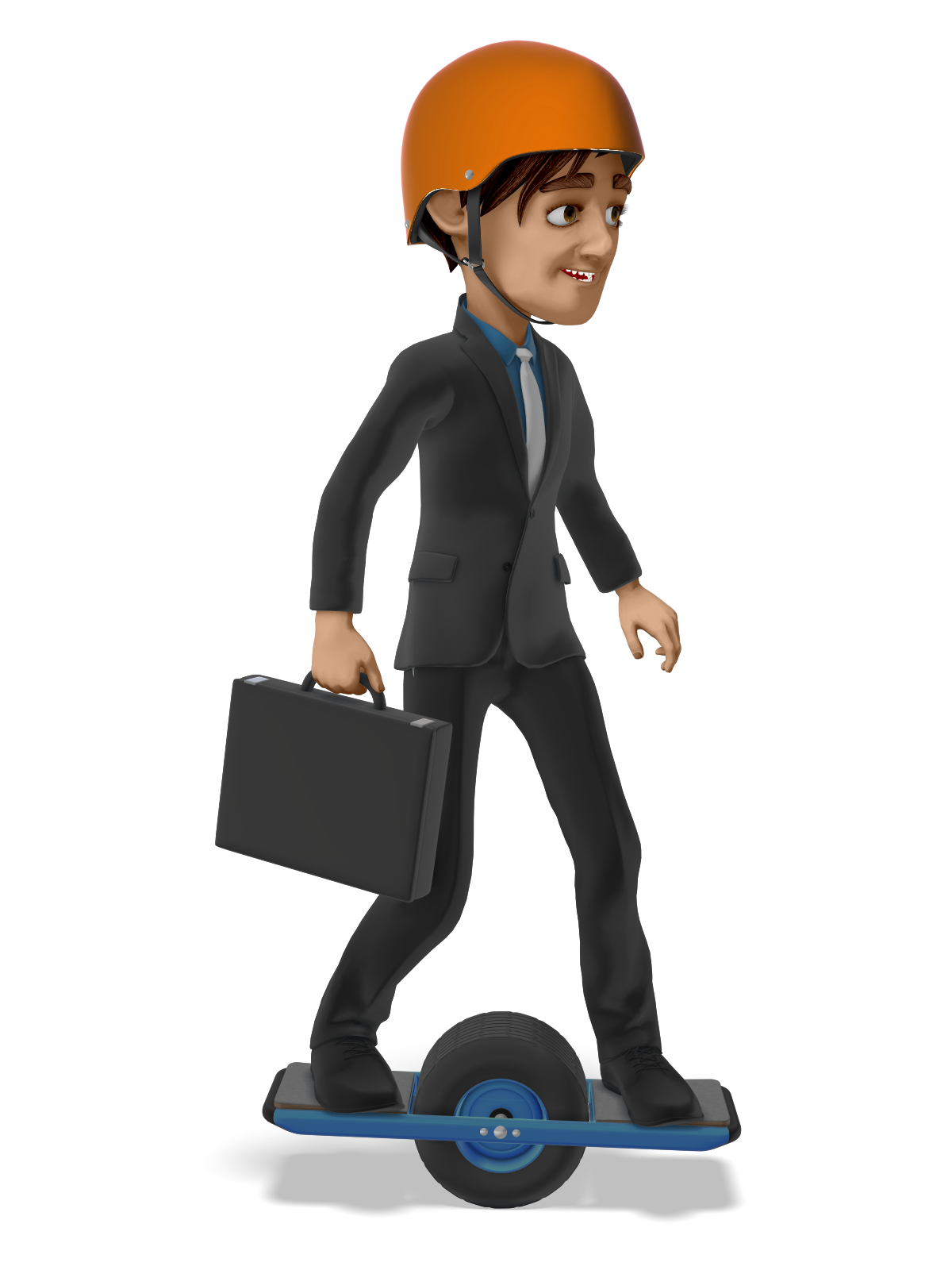 This clipart image features the presentation character Brad riding an electronic one wheeled device to work. Brad is holding onto a briefcase, while happily maintaining his balance on the device as he rides towards the office. Use this clipart image for all of your transportation and business themed presentations