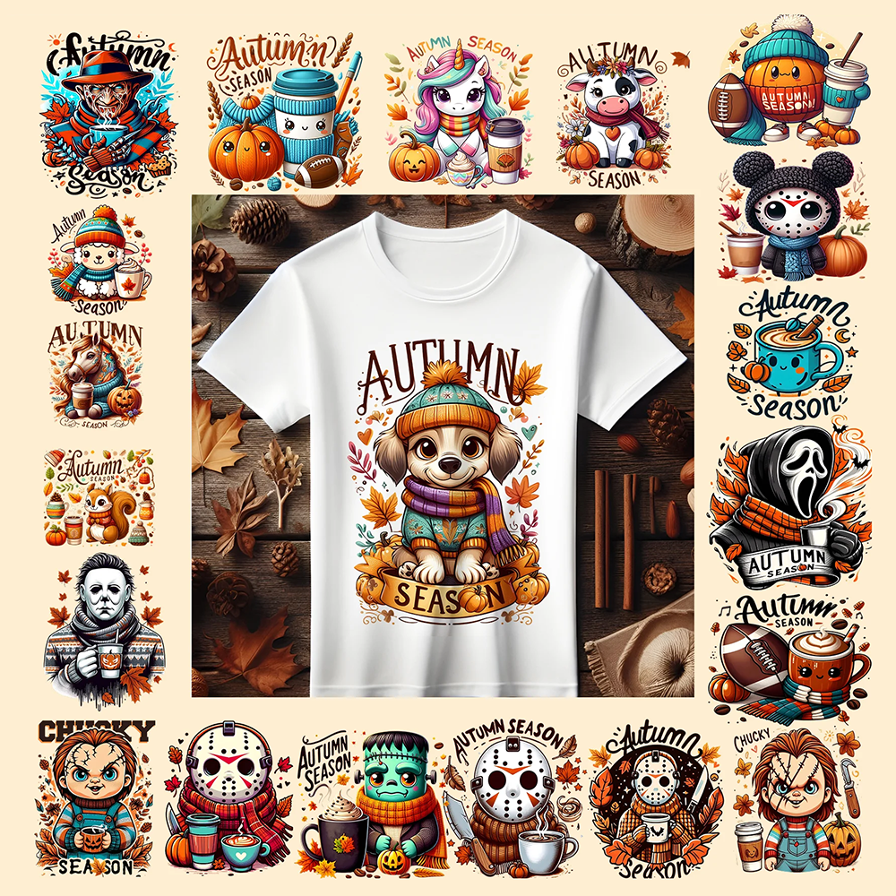Each design captures the cozy autumn vibe β pumpkins, coffee cups, sweaters, cute animals, and even fun Halloween-inspired characters β all with rich seasonal colors and hand-drawn charm.