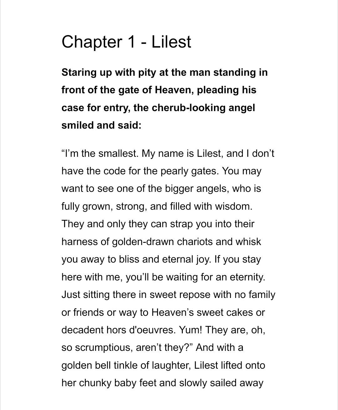 Free Audio Preview! Book and Chapter 1 Audio. This is the story of Lilest, a girl who became an angel when she died unexpectedly at an early age under dubious circumstances. Being much smaller than most angels, she flitters around bemoaning her lack of time to enjoy life. One day all angels are assembled and told she has been gifted Earth as the sole angel and that humans will live in a world designed by her. An imaginative yet gritty story filled with thrilling adventure and science fiction.
