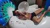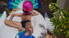Laying on one giant inflatable peacock Julien start by blowing 3 balloons and bursting them with a knife.