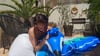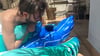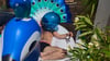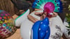 Julien blow balloons and destroy inflatable peacock