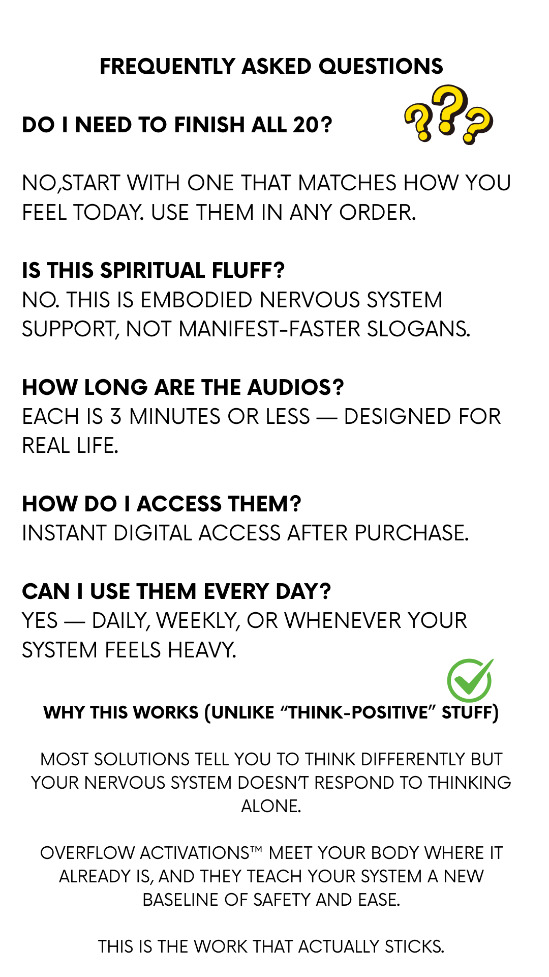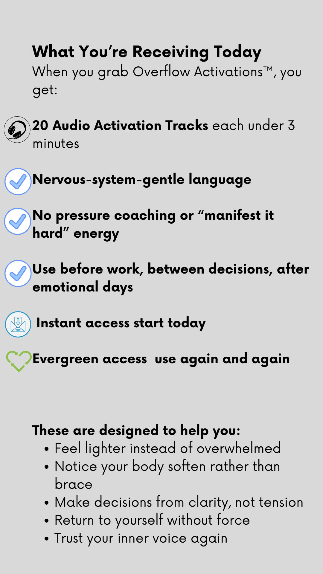 Overflow Activations™ are short (≤ 3 min), streamable guided audio experiences that help you feel lighter and more grounded instead of mentally braced, uncertain, or quietly worried so that you actually live your life from a place of presence, solidity, and inner voice.