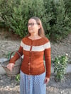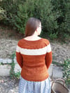It is worked from top down, seamlessly, with a rounded yoke. A lacy panel goes through the yoke, as if to highlight it. This lace pattern is explained by chart.