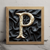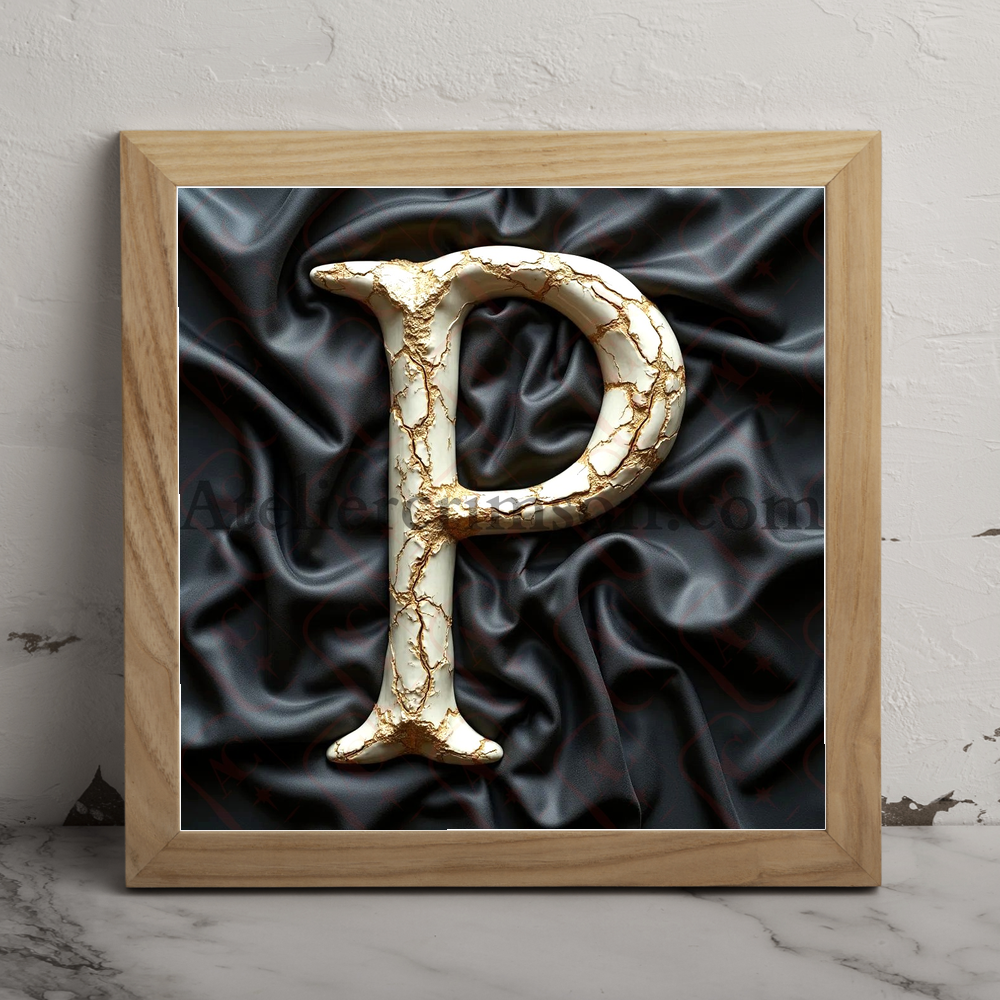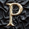 The letter P Bones with gold fissures A hauntingly beautiful character crafted from pristine human femur bones, intricately arranged to form a bold, serif typeface. Delicate golden fissures, reminiscent of kintsugi art, weave through the ivory-white osseous structure, adding an element of elegant repair. The character stands proudly on a luxurious marbled floor, its form casting subtle shadows. Behind it, a textured black linen backdrop provides a striking contrast, emphasizing the letter's ethereal beauty.