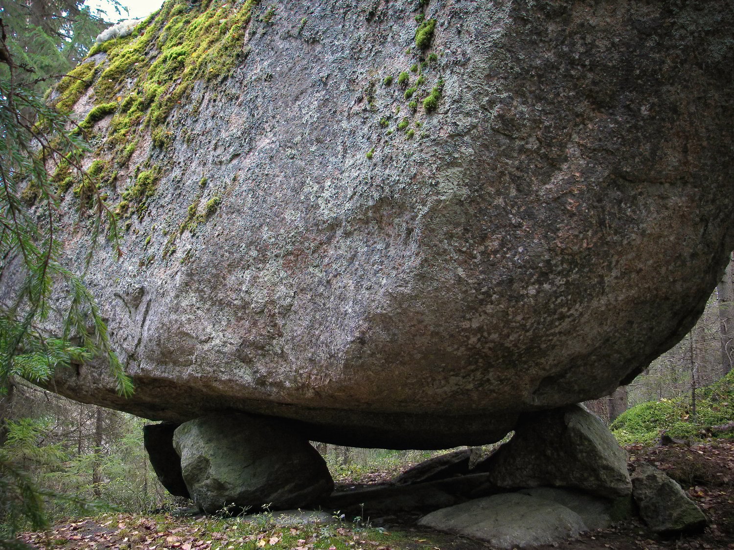 A large boulder rests on top of small stones.