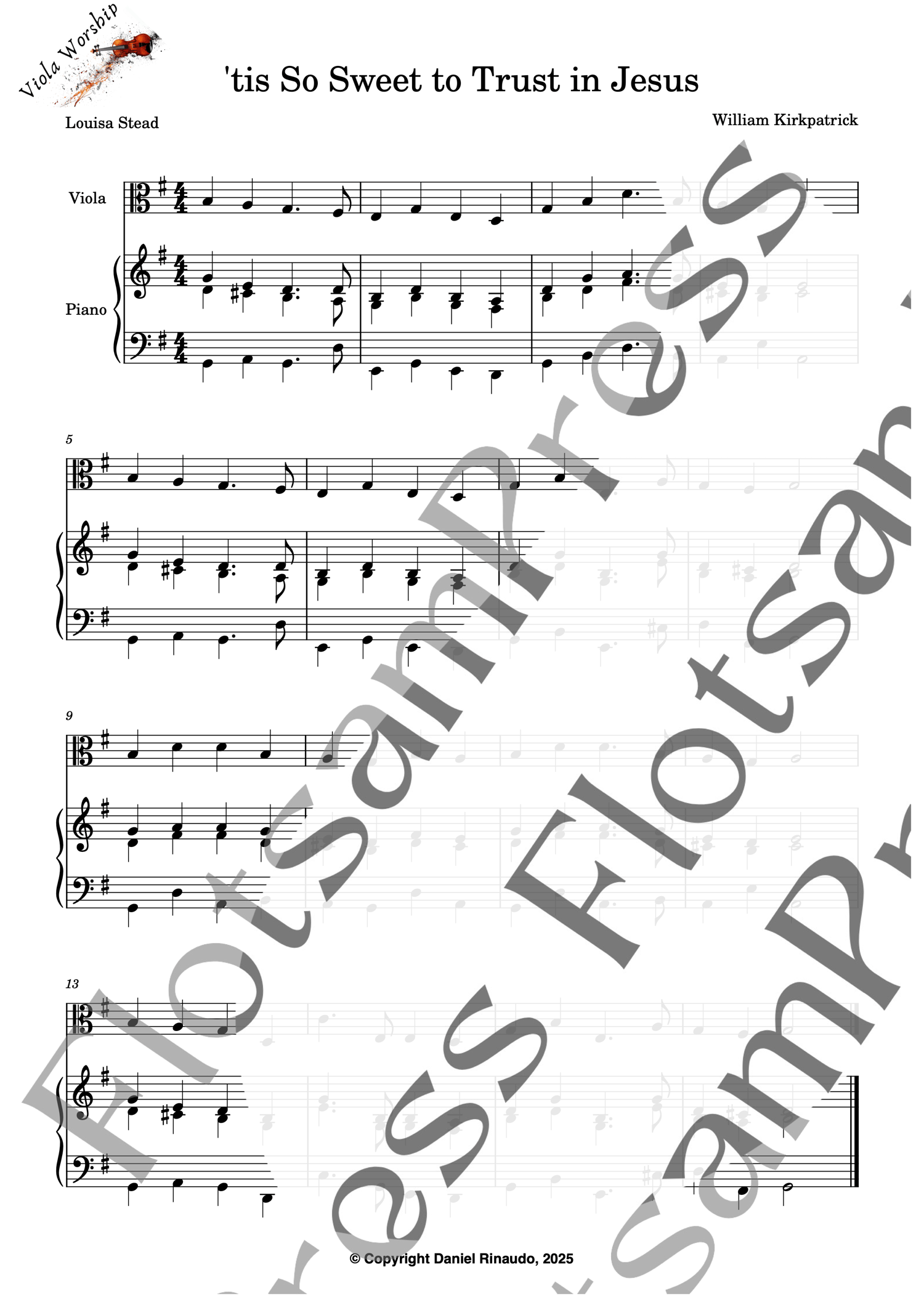 This arrangement of 'tis So Sweet to Trust in Jesus is written for beginner to lower-intermediate viola players, with a simple and supportive piano accompaniment. Perfect for church services, lessons, or home practice.
