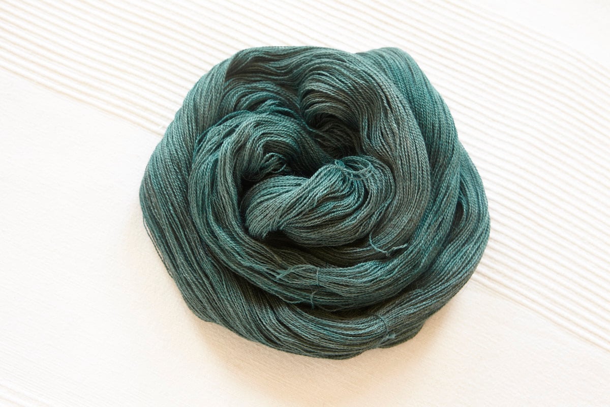 Whisper (Lace) in colorway: Green Marble. Tonal variegated. Medium-dark slightly muted greyish green with tonal variation, almost semi-solid