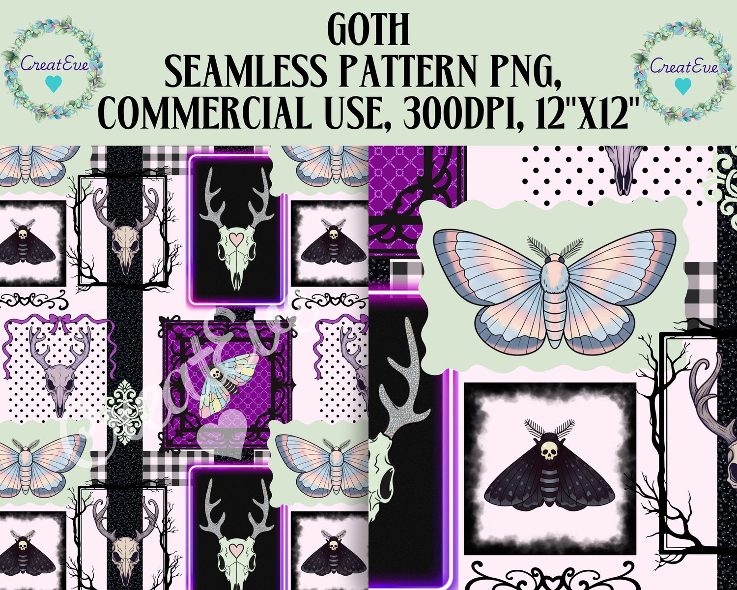Goth Moth & Antler Deer Skull Pastel Seamless Pattern, Commercial Use, 300dpi, 12" x 12"
