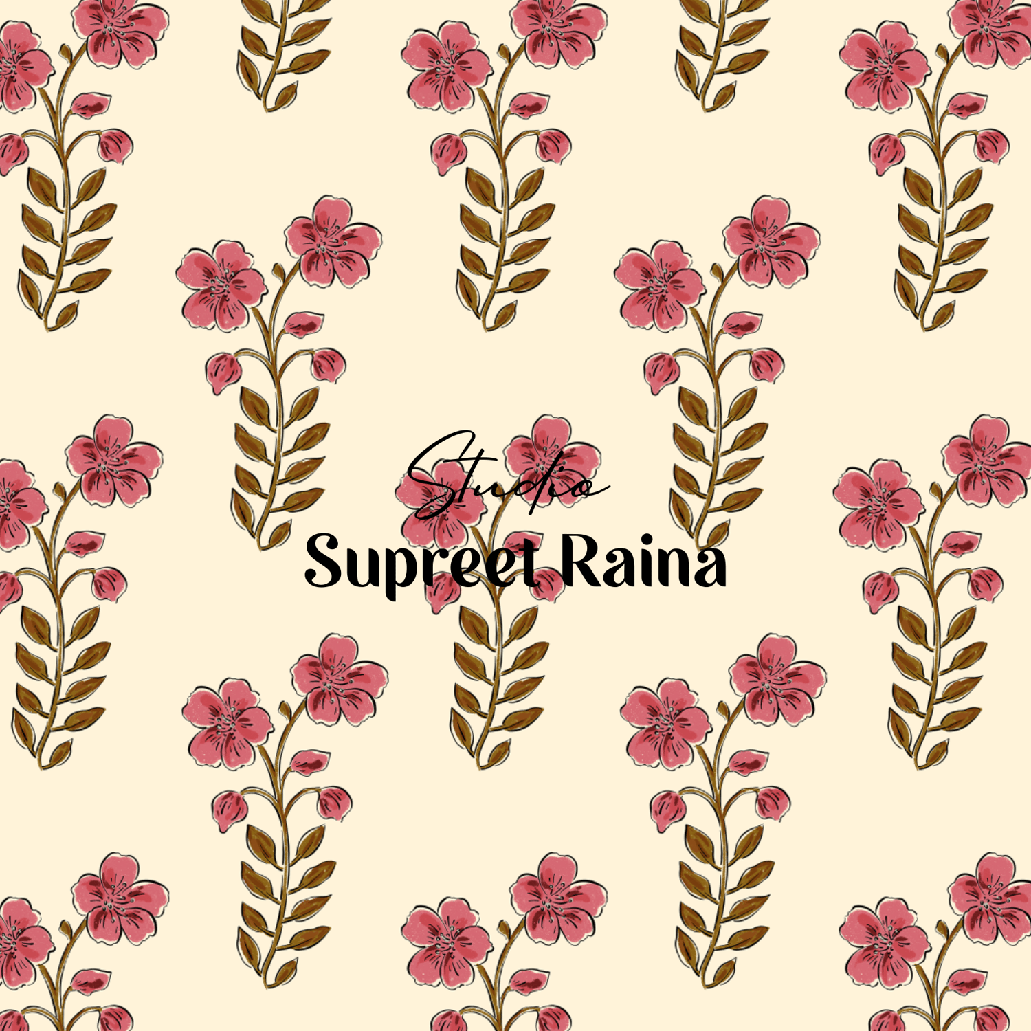 A seamless floral pattern inspired by traditional Indian hand block prints, featuring stylized rose-toned blossoms and warm brown foliage set against a soft champagne background.