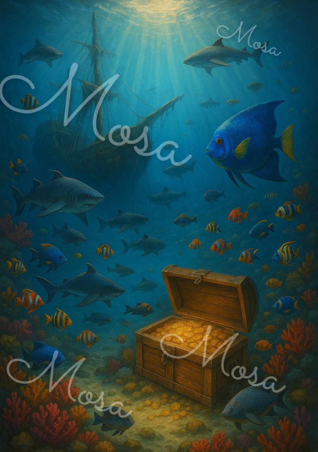 Dive into a breathtaking underwater world with this stunning digital artwork. "Depths of Treasure" captures the mysterious beauty of a sunken shipwreck nestled among vibrant coral reefs, with a glowing treasure chest spilling gold coins into the ocean floor. Surrounding the scene are colorful tropical fish and majestic sharks, adding drama and life to the composition.