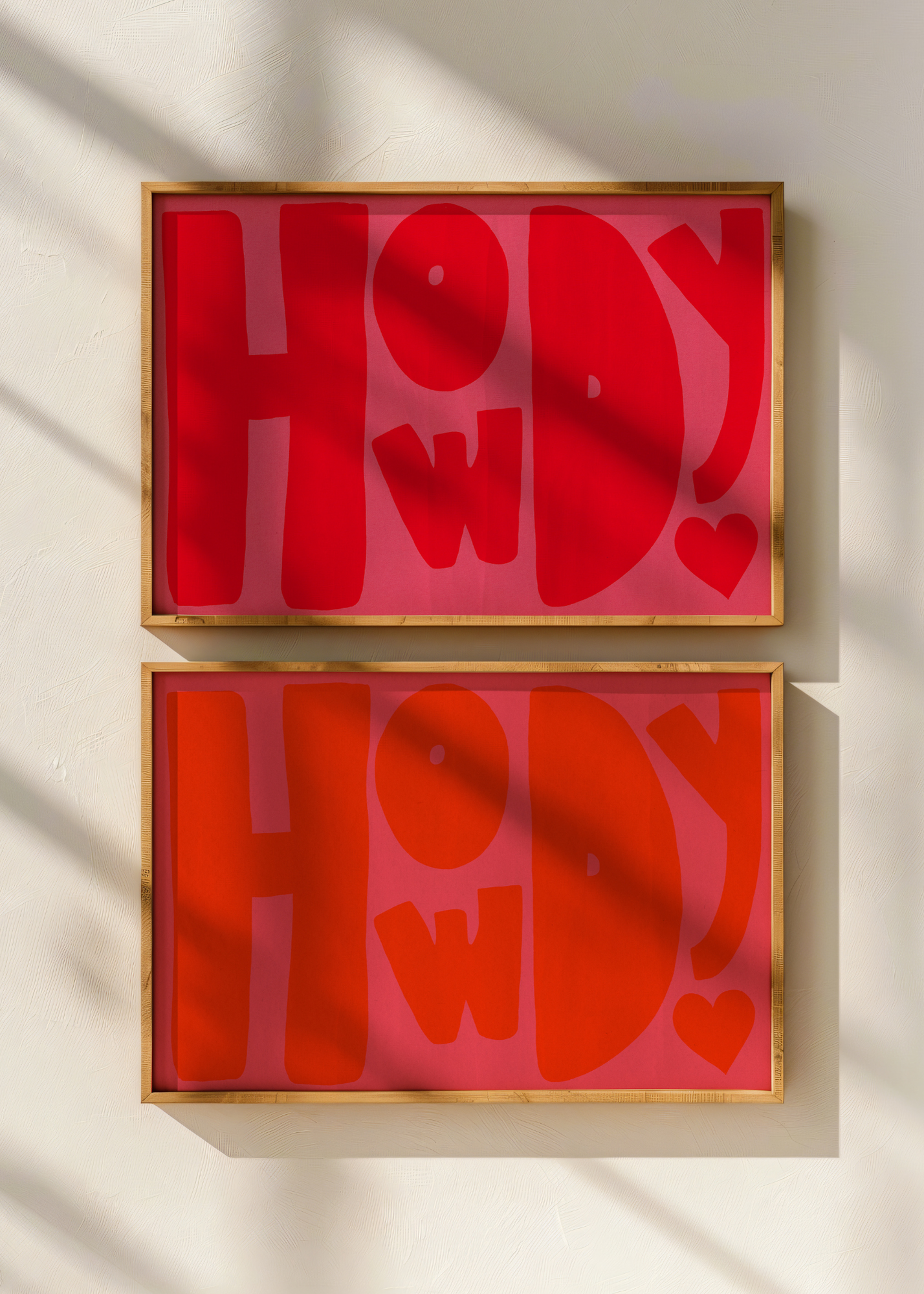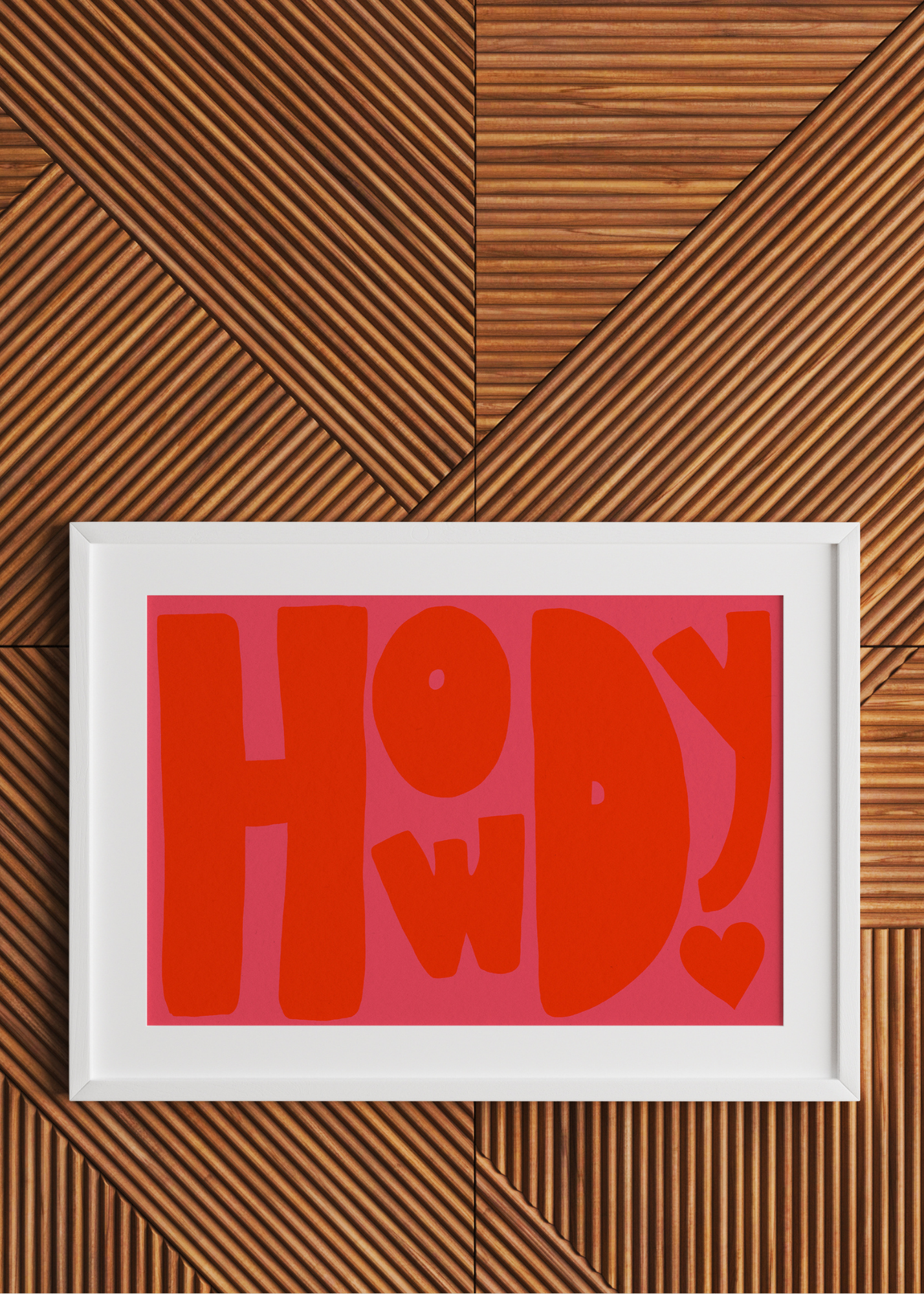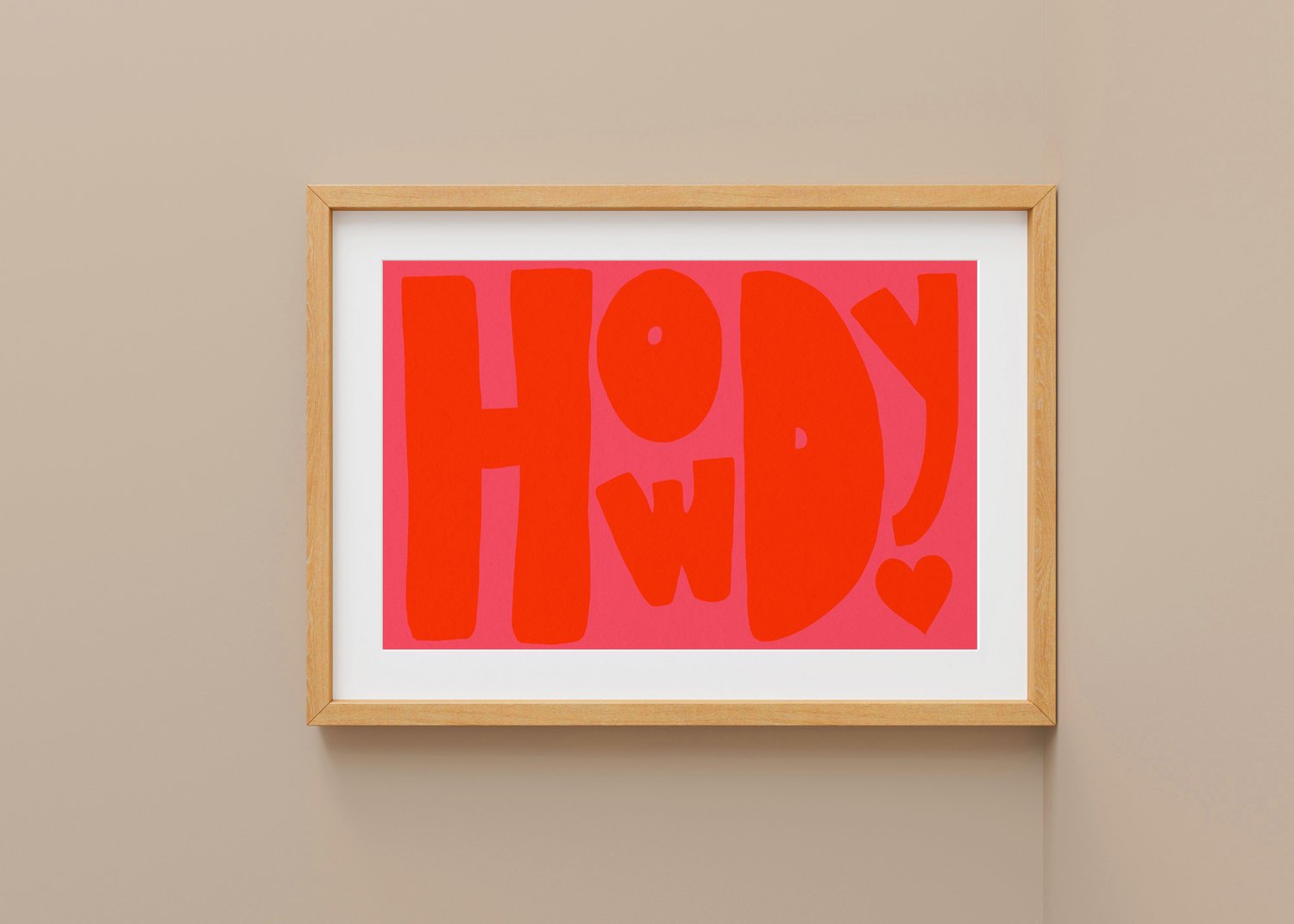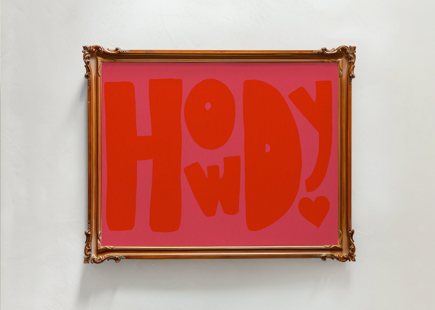 Howdy— This print is bold, playful, and absolutely packed with personality. A bright pink background sets the stage for the hand-drawn lettering of “Howdy” in a brilliant orange red—complete with a sweet little heart for extra charm. It’s the kind of greeting that kicks off good stories, invites laughter, and brings a little Southern sass wherever it hangs.