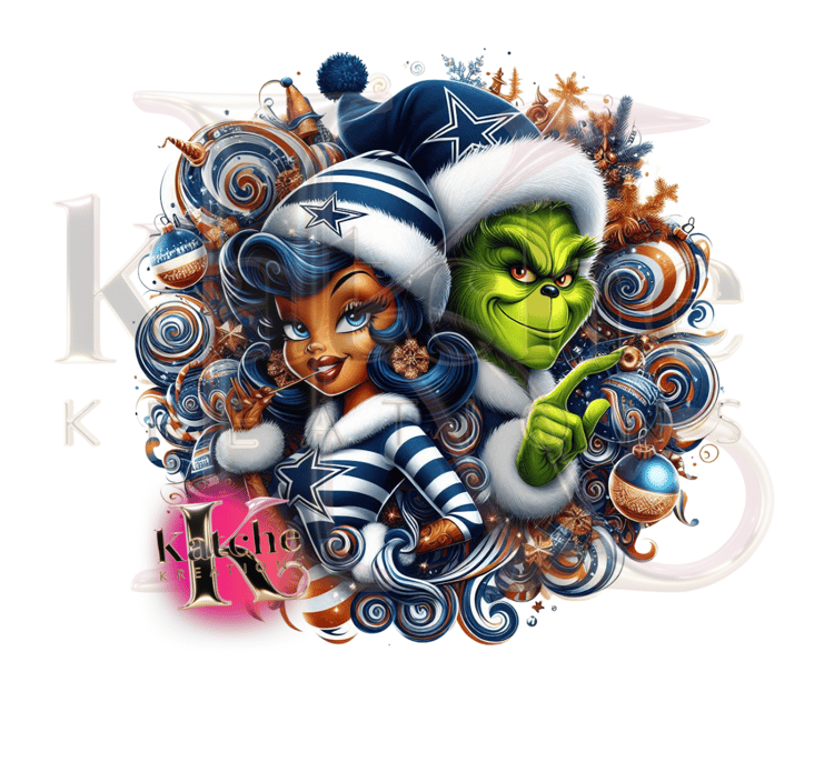 Show off your Cowboys pride with holiday style! This Dallas Cowboys Christmas Grinch & Diva digital download combines festive charm with team spirit, featuring a sassy diva in Cowboys gear alongside a mischievous Grinch sporting a Santa hat adorned with the Cowboys star. With a swirl of snowflakes, stars, and ribbons, this unique design is perfect for holiday projects that celebrate both the season and your favorite team.