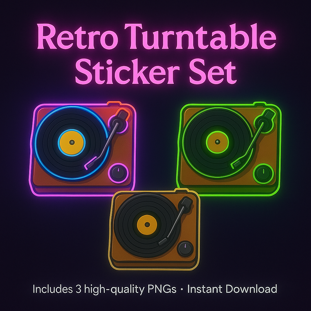 Retro Turntable Sticker Set – Neon & Classic Vinyl Vibes (3 PNGs)