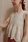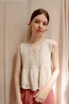 The Rose Ruffle Top is worked top down starting from the back. We start by knitting two mirrored back pieces shaped with German Short Rows. Then the fronts are picked up from the shoulders and joined together into a lace panel. Next the top is joined in the round and worked in pattern.