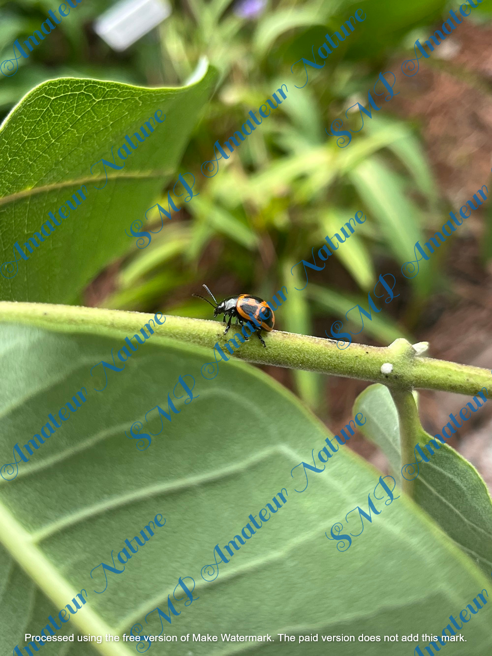 Amateur photograph of a Swamp Milkweed Leaf Beetle (Labidomera clivicollis). While these beetles are not directly a threat to monarch caterpillars, they do eat the seeds of milkweed plants so they have the potential to reduce resources for the caterpillars. Image taken in Virginia, USA. Image pixels 3024x4032. Image easily resized as required for buyer needs. Purchase gives image without any watermark.